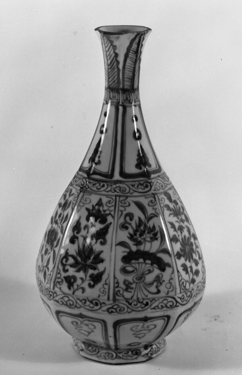 Fiasca piriforme con corpo sfaccettato di sezione ottagonale in porcellana bianca dipinta in blu cobalto sotto vetrina e poggiante su corto listello ottagono, leggermente obliquo. Il corpo è ornato negli otto specchi con racemi fioriti e virgulti negli angoli, scanditi da filetti verticali e chiusi entro due fasce orizzontali di virgulti ripetuti sul listello. Sulla spalla, quattro specchi con foglie di loto sormontati da una fascia di greche e attorno al collo quattro foglie verticali con nervature fitte. La pancia del vaso è ornata con otto specchi che ripropongono le foglie di loto della spalla, ma volte in basso, dipinte a semplice tratto