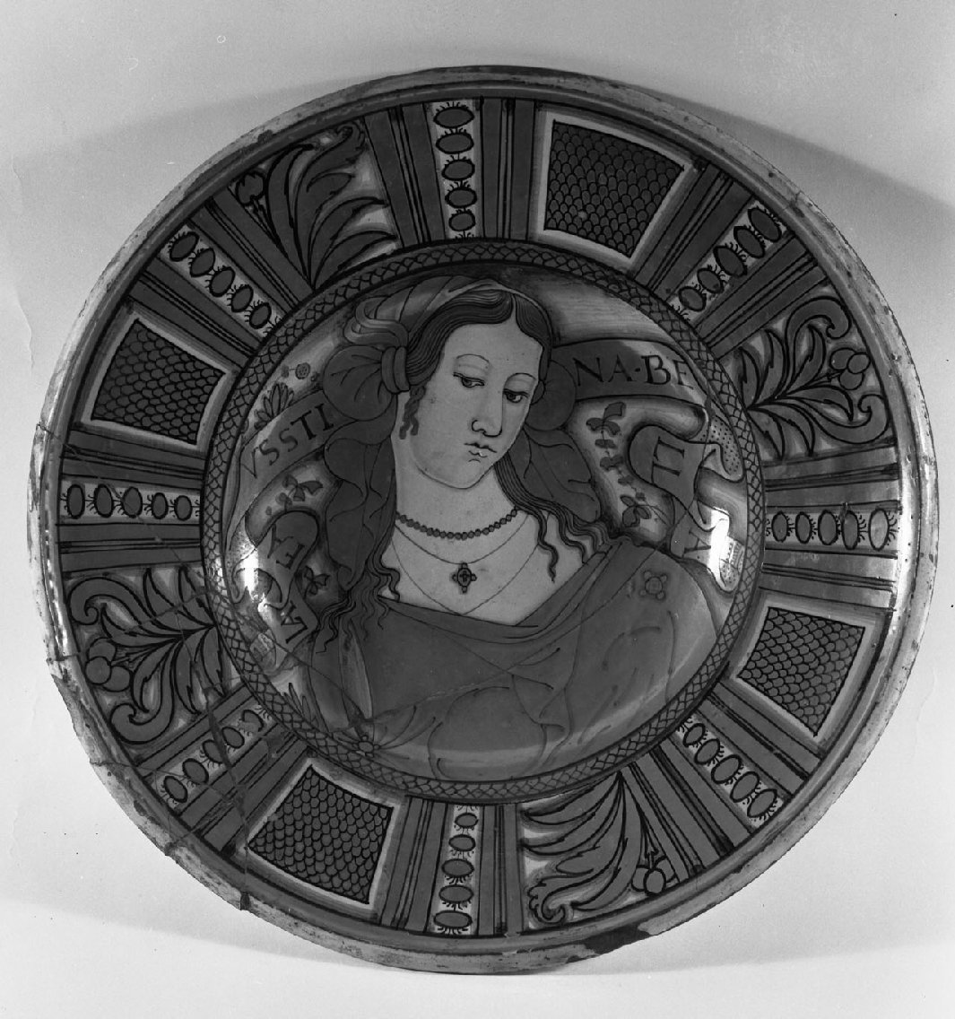 Piatto da pompa in maiolica blu e lustro oro con retro solon verniciato poggiante su listello forato per appensione. Il piatto ha un grande cavetto, tesa obliqua e orlo rialzato. Al centro mezza figura femminile volta a destra con lunghi capelli trattenuti da sciarpa annodata. In campo, ai lati, nastro svolazzante con iscrizione. La figura è incorniciata da una rigida ghirlanda di foglie. La tesa è suddivisa in specchi con squame, mandorle, bande lisce separate da un motivo vegetale stilizzato con ovali e viticci collegati. Il retro è ricoperto con una vernice giallastra
