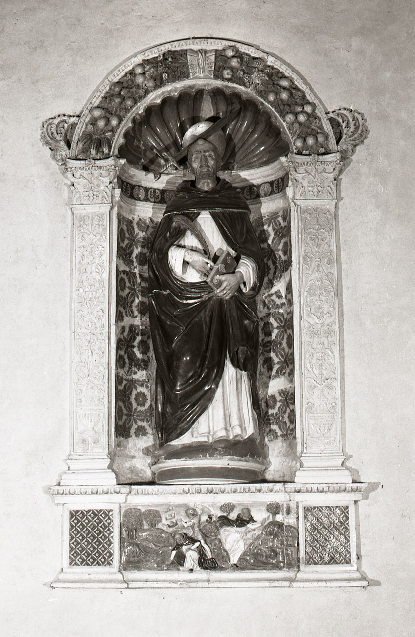 s. Pietro martire, domenicano di Verona, vestito con l'abito bianco e nero dell'ordine, reca in mano un libro chiuso e una penna; ha la testa trapassata da una spada. E' inserito in una nicchia definita da bianchi pilastrini ornati da candelabre, da un arco con decorazione policroma aggettante, di frutti e fiori. Vivace policromia anche all'interno della nicchia con la conchiglia azzurra e l'incavo disegnato a mò di stoffa bianca e verde. Nella predella sono raffigurati s. Pietro in un paesaggio collinare e sempre il santo mentre riceve tre corone