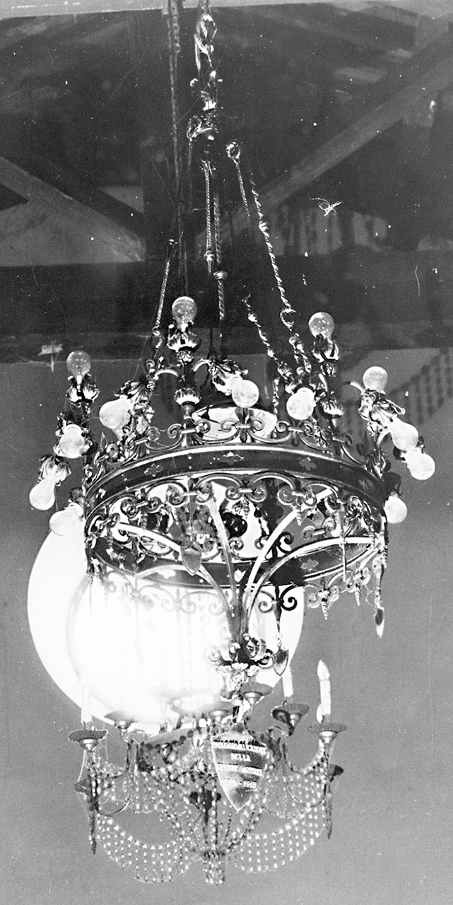 Corona circolare decorata da quadrifogli distanziati su cui s'innestano sei gruppi luminosi a tre bracci fitomorfi su cornice a gigli, in basso nervature concave terminanti in volute raccordate, scudo pendente
