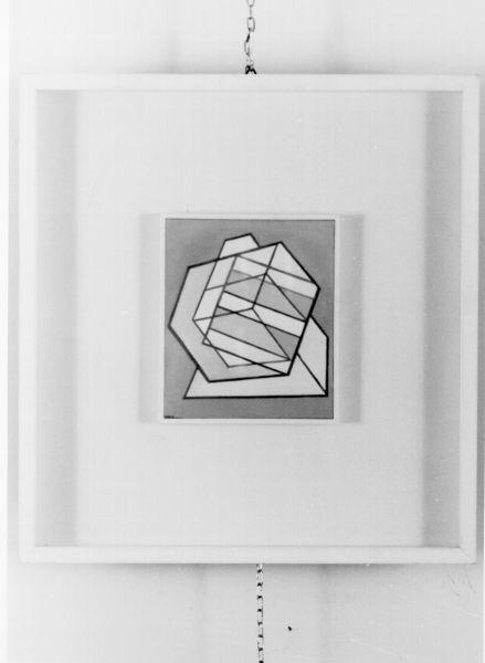 Dipinto ad acrilico su tela raffigurante dei solidi che si compenetrano. Colori: rosa, rosso, bianco. Firmato in basso a sinistra
