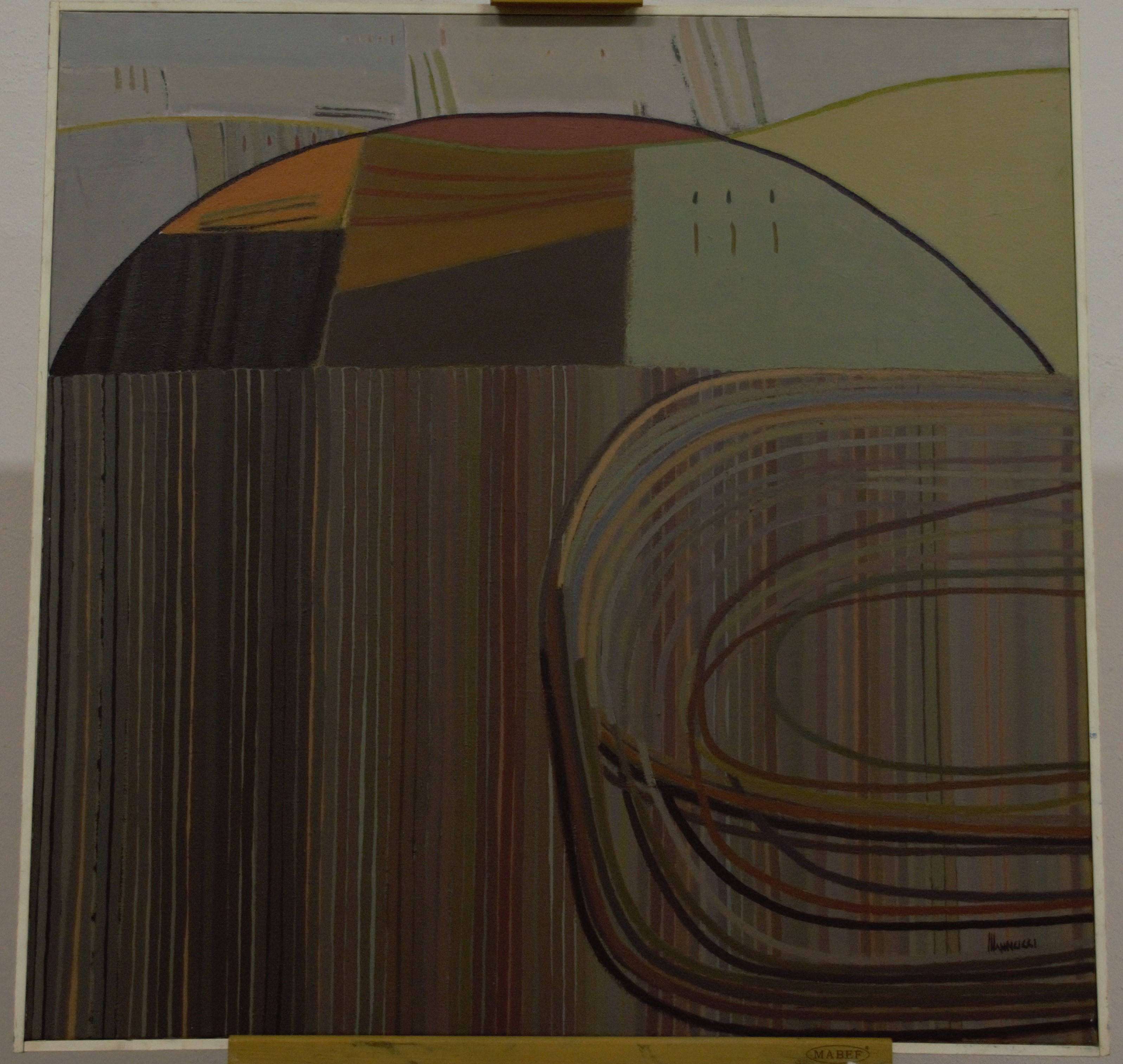 Dipinto ad acrilico su tela raffigurante nella parte superiore delle forme tondeggianti simili a colline, in basso una serie di righe tutte nei colori naturali delle terre e dei verdi. Colori: mattone, violaceo, nero e rosso. Firmato in basso a destra