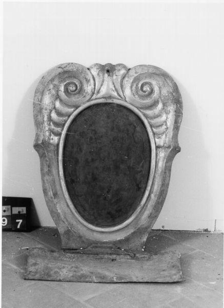 Piccolo scudo in legno intagliato e dorato con la parte centrale color rame. L'oggetto posa su di una base in ferro dipinta color oro; ha uno scudo ovale contornato in alto da volute affrontate