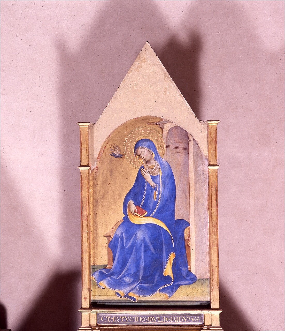 Personaggi: Madonna. Abbigliamento: all'antica. Architetture: casa. Oggetti: libro; cuscino; sedile. Simboli: (Spirito Santo) colomba