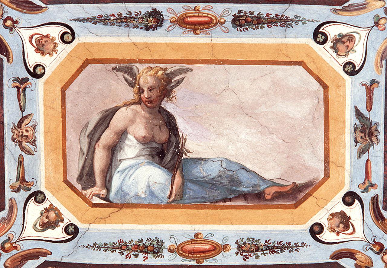 - NOTIZIE STORICO CRITICHE Il progetto di Cosimo I, mirante a raccogliere nel secondo piano del palazzo degli Uffizi le sue prime collezioni artistiche, fu attuato da Francesco I, che nel 1584 avrebbe commissionato la Tribuna al Buontalenti, ma che già nel 1581 faceva decorare il soffitto del corridoio di levante, destinato alle statue e ad una raccolta di ritratti di uomini celebri. Oltre che essere dipinta in una delle campate strette, la data si ricava dai "Ricordi" di Alessandro Allori, dove sono documentati anche i nomi dei frescanti che parteciparono all'impresa e che circa dieci anni prima avevano lavorato per lo stesso granduca nello Studiolo di Palazzo Vecchio. In data 23 settembre 1581 ricevettero il saldo completo per la loro opera, iniziata nell'aprile di quell'anno, l'Allori stesso, Ludovico Buti, Giovan Maria Butteri,Giovanni Bizzelli, Alessandro Pieroni, oltre a Giovanni Cosci, Ludovico Cigoli (ventiduenne), Gabriello Caccini garzone del Butteri, Cecchino Mati e Pierino del Meglio, scolari dell'Allori. Colpisce la presenza del giovnae Cigoli, mentre non compare il nome di Bernardino Poccetti al quale la tradizione, generata probabilmente dal Baldinucci, assegna la decorazione del primo corridoio e delle salette dell'Armeria. Le 45 campate del soffitto sono decorate da finissime grottesche in cui sono rappresentate scene mitologiche, paesaggi, motivi decorativi di libera fantasia con fiori, uccelli e altri animali, e figure fantastiche. Sia sotto il profilo stilistico che iconografico,il confronto più stringente è con la volta della stanza adiacente al cortile in Palazzo Salviati, decorata a grottesche fra il 1574 e il 1575 dalla stessa equipe di frescanti e di cui l'Allori era stato ancora una volta il capomastro e l'ideatore