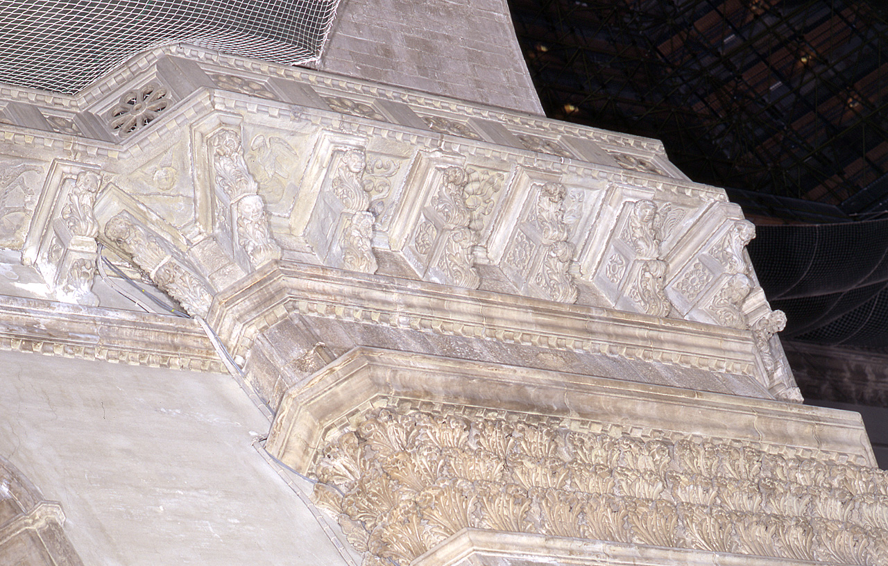 - NOTIZIE STORICO CRITICHE Per quanto riguarda questa zona di balaustra la Lisner ipotizza che le raffigurazioni dell'aquila che afferra la lepre e del gallo sopra le spighe abbiano un significato araldico e che il rilievo col cane macilento sia un'allusione sarcastica a Maso degli Albizi che nel 1414 era per la terza volta gonfaloniere di giustizia (morì nel 1417), notando che un cane simile si trova nella sua tomba a San Pierino