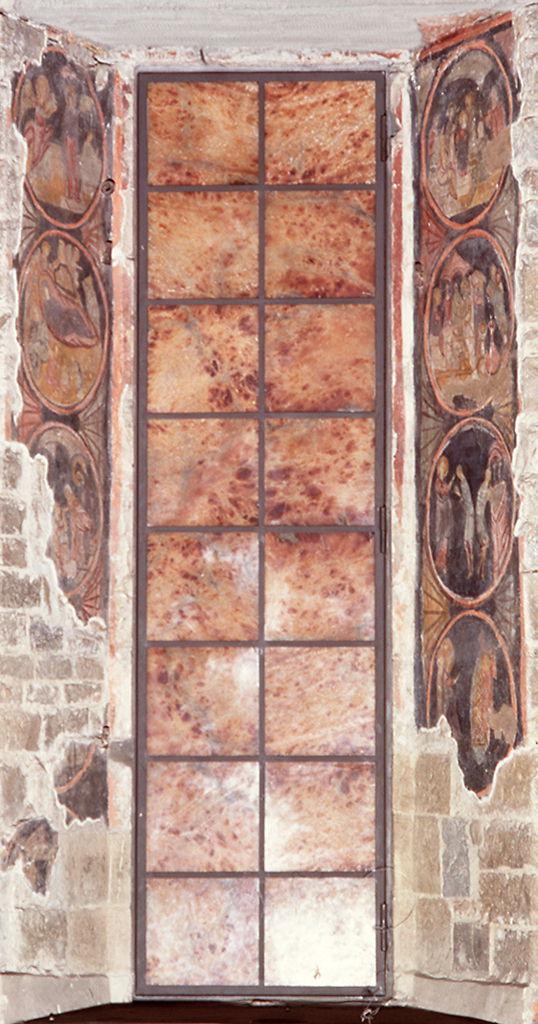 - NOTIZIE STORICO CRITICHE Conservatisi grazie a una parete che accecava completamente la finestra, i sette medaglioni dovevano far parte di un piccolo ciclo raffigurante storie della vita di Cristo. Il Sanpaolesi suppone che in origine fossero 12, come si puo' ricavare dalle misure della finestra in rapporto a quelle dei medaglioni con le scenette. Mancherebbero la 'Presentazione al tempio' la 'Fuga in Egitto' e la 'Strage degli Innocenti' fra le due scene con l' 'Adorazione dei Magi' e la 'Disputa' e la 'Resurrezione di Lazzaro' e la 'Samaritana al pozzo' (o un altro miracolo di Cristo) a conclusione del ciclo. Lo studioso ritiene che l'autore della decorazione sia il maestro vetraio che esguì la vetrata della finestra: un bizantino "con ricordi siriaci" attivo a S. Pier Scheraggio alla fine del XII secolo. Della stessa opinione si dichiarano i Paatz, mentre il Salmi, seguito dalla Marcucci, ravvisa negli affreschi una prova della diffusione a Firenze della miniatura bolognese della fine del '200. Il Ragghianti li giudica opera di un raffinato ed elegante pittore neoellenizzante e li pone in relazione con i mosaici del Battistero fiorentino raffiguranti le 'Storie di San Giuseppe'