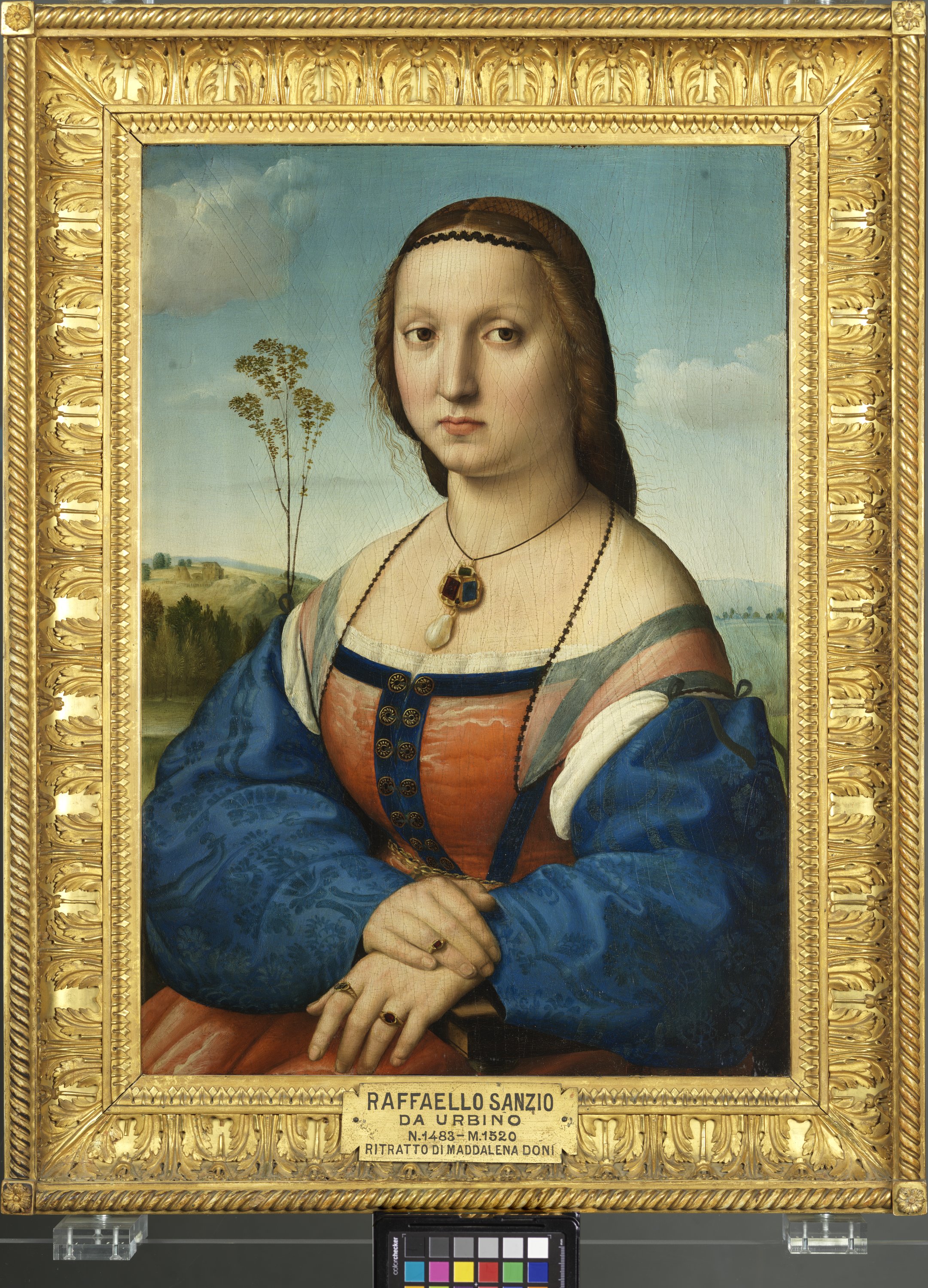 - NOTIZIE STORICO CRITICHE Il ritratto di Maddalena Strozzi (1489-1540), moglie di Agnolo Doni, è stato commissionato a Raffaello, secondo la testimonianza di Giorgio Vasari, dal marito in occasione delle loro nozze, (Le Vite, Edizione Giuntina 1568): “Dimorando adunque in Fiorenza, Agnolo Doni, il quale quanto era assegnato nell’altre cose, tanto spendeva volentieri - ma con più risparmio che poteva - nelle cose di pittura e di scultura, delle quali si dilettava molto, gli [a Raffaello] fece fare il ritratto di sé e della sua donna in quella maniera che si veggiono appresso Giovan Battista suo figliuolo nella casa che detto Agnolo edificò bella e comodissima in Firenze nel corso de’ Tintori, appresso al Canto degl’Alberti”. I due ritratti furono dipinti en pendant e formavano originariamente un dittico tenuto insieme da una “incorniciatura a sportello” che permetteva la visione delle scene raffigurate sul retro dei rispettivi pannelli, uno consequenziale all’altro, tratti dalle Metamorfosi di Ovidio. Nei due ritratti, con ogni probabilità collocati nella camera da letto nuziale, i coniugi sono presentati in modo simile, ma non identico: seduti leggermente di tre quarti, contro un luminoso paesaggio sotto un cielo azzurro. I due pannelli rimasero in possesso del ramo fiorentino della famiglia almeno fino al Settecento, quando, in data imprecisata, furono portati in Francia da Ippolito Doni, erede del ramo francese della famiglia. Nel 1824 gli eredi Doni offrirono in vendita i due ritratti che furono acquistati dal Granduca di Toscana Leopoldo II di Asburgo – Lorena e portati a Palazzo Pitti. A partire dal 2018 i coniugi Doni sono esposti agli Uffizi accanto al Tondo Doni di Michelangelo