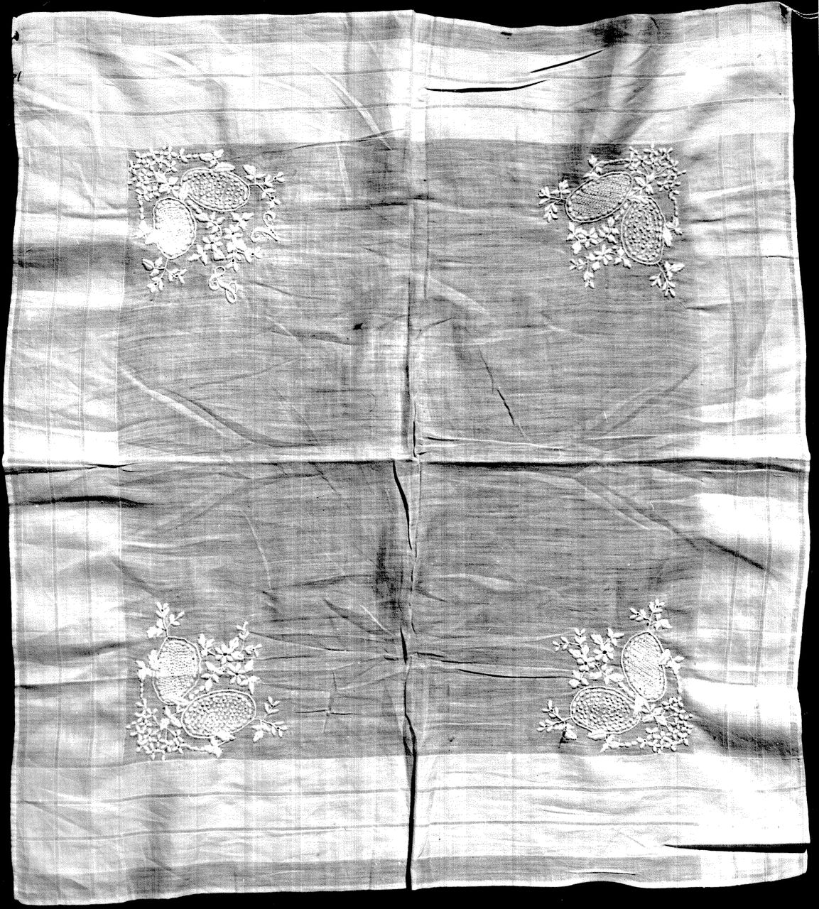 Mussola di cotone ricamata in bianco con filato di cotone. Lavoro ad ago a punto pieno, cordonetto obliquo, nodi francesi e filze. Il fazzoletto ha forma quadrata ed una cornice interna di tessuto operato con tre balze perpendicolari agli angoli. Nella parte interna del fazzoletto in corrispondenza dei quattro angoli è ripetuto lo stesso ricamo: esso consiste in due cornici ovali speculari che si dipartono da una sottile ghirlanda,che occupa l'angolo. Queste sono eseguite con il punto filza usato in alternanza al dritto e al rovescio, per creare un effetto chiaroscurato. Tra le cornici ovali si innalza in verticale un tralcio fiorito con corolle stilizzate e ondulati rami di foglie. Ai suoi lati nascono due rametti con andamento opposto a destra e sinistra