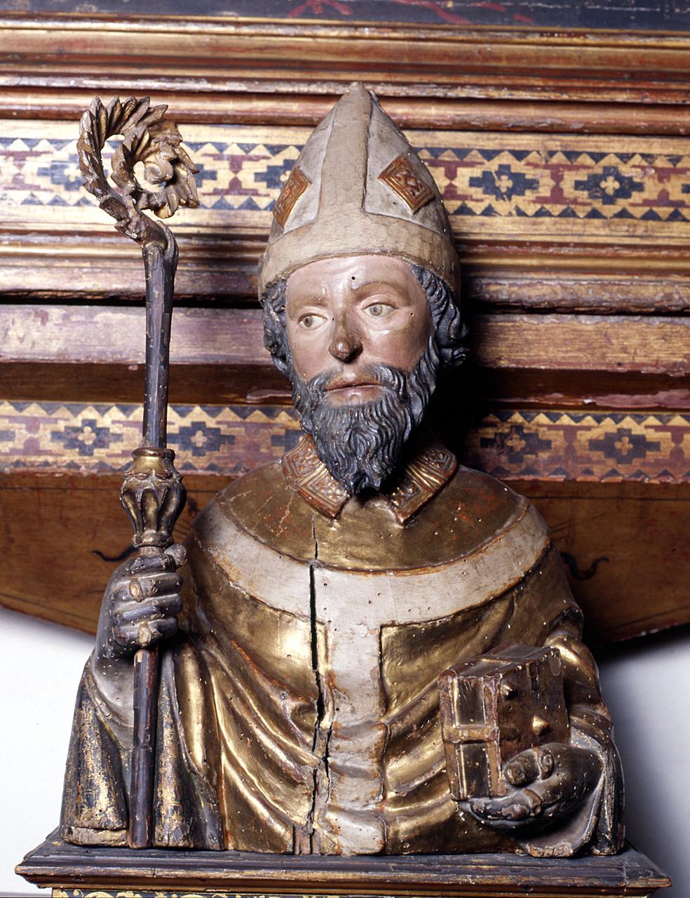 Figure: Santo Vescovo. Abbigliamento: all'antica. Attributi: (Santo vescovo) mitria; piviale; pallio; pastorale; libro. Oggetti: anelli