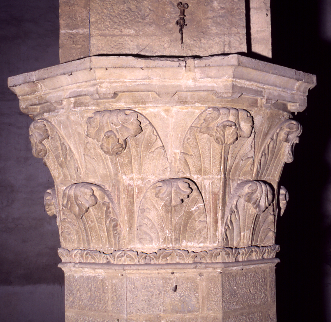 - NOTIZIE STORICO CRITICHE Come hanno chiarito i Paatz e poi il Conti la basilica e' stata costruita partendo dal transetto verso la facciata. Questo capitello, pertanto, e' stato eseguito ad un livello avanzato dei lavori e senz'altro dopo la meta' del secolo XIV. Infatti la fabbrica della basilica era ancora alla quinta campata nel 1341, data scritta su una delle travi del tetto costruito, come dimostra il Conti, contemporaneamente alle campate