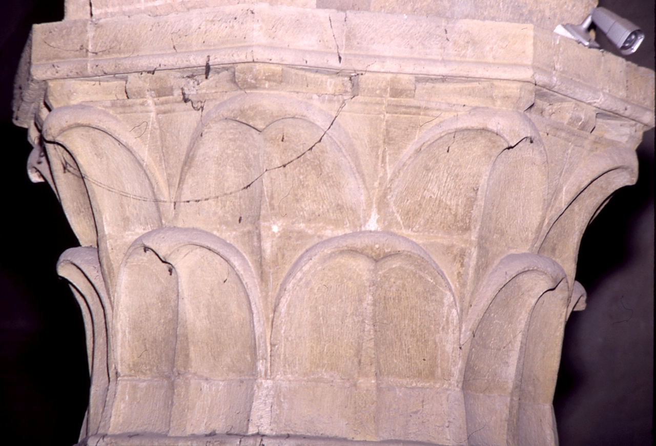 - NOTIZIE STORICO CRITICHE Come chiariscono prima i Paatz e poi il Conti, essendo iniziata la fabbrica della basilica a partire dal transetto e venendo verso la facciata, questo capitello e' uno degli ultimi eseguiti, probabilmente ormai sul finire del secolo XIV. La fabbrica era infatti ancora alla quinta campata nel 1341, data scritta su una delle travi del tetto costruito, come dimostra il Conti, contemporaneamente alle campate