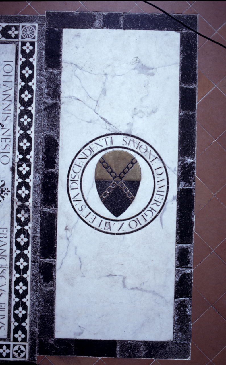 - NOTIZIE STORICO CRITICHE Nel Libro del 1441 e' ricordata la sepoltura di Amerigo Zati, padre del Simone cui e' dedicata la lastra in oggetto. La decorazione della lastra, limitata ai cerchi concentrici intorno allo scudo, non costituisce un elemento di datazione, poiche' la si trova per tutto il XV secolo, come hanno confermato i recenti studi della Chiti e della Jacopino. Ad indicare come ambito cronologico la seconda meta' del Quattrocento e' piuttosto l'iscrizione in maiuscole romane, carattere che si afferma solo dopo il 1450, abbellite dalle 'grazie', elemento diffuso dopo il 1467, anno di costruzione della cappella Rucellai in S. Pancrazio a Firenze dove le 'grazie' compaiono per la prima volta ad opera di Leon Battista Alberti