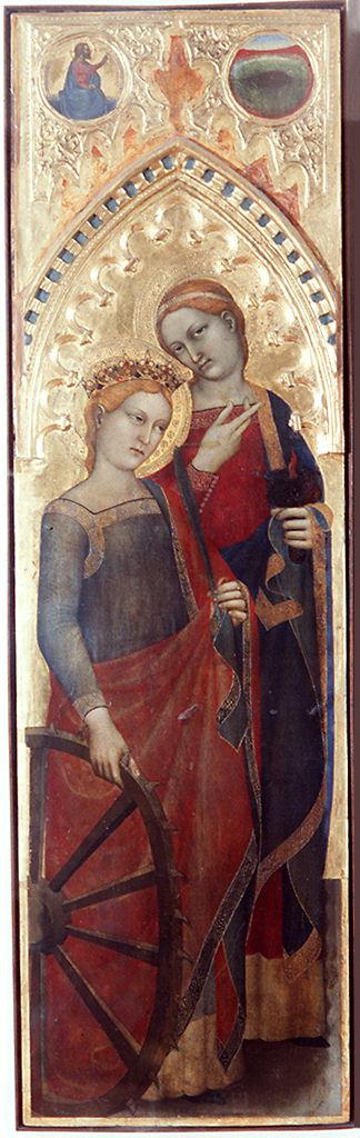 - NOTIZIE STORICO CRITICHE Il polittico fu realizzato per l'altar maggiore della chiesa d'Ognissanti. Il polittico risulta già smembrato nel 1758 quando il Lami lo ricorda come una tavola "pentaptycha", mentre alla fine del Seicento padre Tognocchi da Terrinca ricorda sette 'lunette' della predella posta sotto alle lunette con i cori (cfr. livelli 6-10), predella eliminata durante lo spostamento dall'altar maggiore alla cappella del SS. Nome di Gesù. Agli Uffizi sono conservati cinque pannelli con due figure di santi ciascuno e cinque scomparti di predella raffiguranti i 'cori'. In origine il polittico si presentava probabilmente in modo simile a quello della pinacoteca di Prato ma con sette scomparti: a ogni coppia di santi corrispondeva una relativa lunetta con un 'coro', mentre ogni coppia di tondi posta su ciascun pannello raffigurava una giornata della Genesi. Al di sotto della predella con i cori era un'altra predella, perduta nel secolo XVI, raffigurante probabilmente le storie della Vergine. Del polittico originale mancano, oltre il pannello centrale e le cuspidi, due scomparti di predella raffiguranti il "coro degli angeli" e il "coro dei confessori" (ricordati dal Tognocchi), un pannello laterale con due santi, probabilmente quello situato all'estrema destra, che avrebbe dovuto rappresentare nei due tondi il settimo giorno della Genesi: "la creazione dell'uomo e della donna" (cfr. Gregori). Riguardo il soggetto del pannello centrale sono state fatte varie ipotesi: secondo Venturi e Marabottini poteva trattarsi di un "Cristo giudice", secondo Suida di una "Madonna in trono", secondo la Marcucci di una "Incoronazione della Vergine" che Mina Gregori avrebbe successivamente individuato in frammento nella collezione Torcuato di Tella di Buenos Aires. La cimasa del polittico è stata individuata da Boskovits in una tavola raffigurante il "Thronum gratiae" con il Padre Eterno, la colomba dello Spirito Santo e il Crocifisso (Venezia, collezione privata). Il pannello con le due Sante Lucia e Caterina doveva essere situato originariamente all'estrema sinistra del polittico, sopra la predellina raffigurante il "coro delle Vergini"