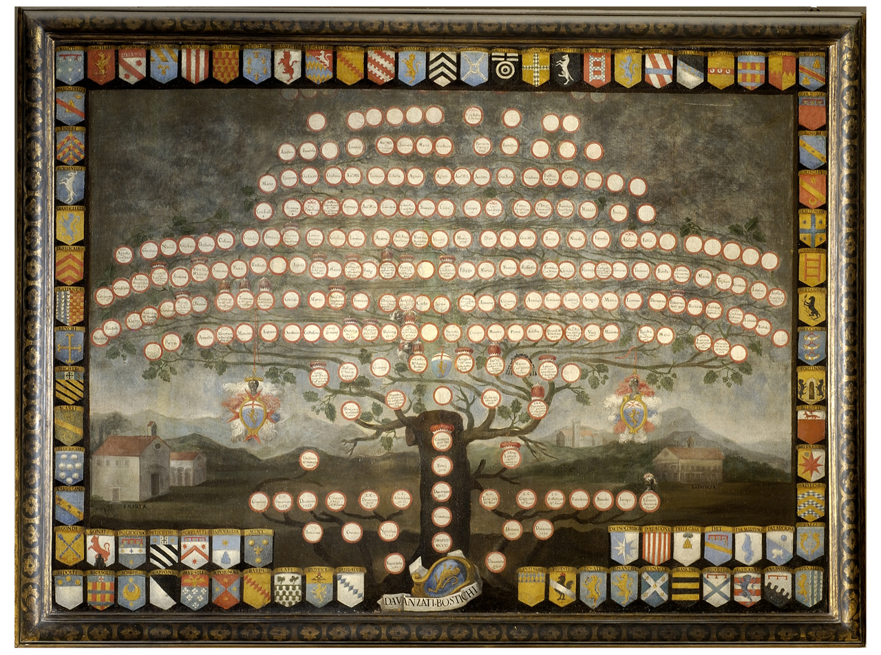 - NOTIZIE STORICO CRITICHE Il dipinto raffigurante l'albero genealogico della famiglia Davanzati fu realizzato verso la fine del Seicento e ripreso da un disegno, ancor oggi conservato presso l'Archivio di Stato di Firenze, nel fondo Carte Pucci, eseguito dall'araldista e antiquario Protasio Felice Salvetti. Il disegno, rispetto al dipinto presenta alcune varianti. Nel vasto paesaggio, non sono rappresentati come di solito avviene in questi dipinti i possedimenti della famiglia, ma soltanto due importanti patronati ecclesiastici il convento di S. Marta a Montughi e quello di Doccia a Fiesole. Come nota la Chiostrini Mannini il dipinto fu realizzato all'interno di una bottega di pittori specializzata in questi temi e si inserisce in quella tradizione ormai affermata nel corso del Seicento della pittura araldica (1988). La sua esecuzione non può esser fatta risalire a prima del 1676 anno in cui l'ultimo discendente della quindicesima generazione dei Davanzati si sposò con una Antinori. Realizzato forse proprio per il palazzo, secondo un uso affermato presso le famiglie magnatizie fiorentine tra Cinque e Seicento, il dipinto nel 1910 è ricordato dal Carocci come ancora conservato nell'atrio di palazzo Davanzati e nel 1934 fu messo all'asta dall'allora proprietario Leopoldo Bengujat senza essere esitato. Nel 1945 l'antiquario Tommaso Fattorini lo cedette al libraio Aldo Gonnelli di Firenze e da allora se ne persero le tracce finché nel 1985 l'antiquario Scarpa di Venezia non lo segnalò sul mercato di quella città. Acquistato da Gioia e Carlo Marchi fu donato al Museo di Palazzo Davanzati nello stesso anno