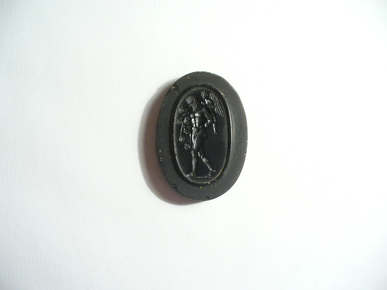 - NOTIZIE STORICO CRITICHE La matrice appartiene a un gruppo di stampi in vetro per la produzione di impronte in zolfo o scagliola commissionati al romano Bartolomeo Paoletti nel 1796 e ultimati nel 1797. Il Paoletti riprodusse i cammei e gli intagli più importanti della collezione glittica dei granduchi di Toscana per un totale di oltre seicento esemplari (per ulteriori notizie si rimanda alla scheda OA 09/00649739). In particolare, la matrice qui considerata deriva da un intaglio conservato presso il Museo Archeologico Nazionale di Firenze (inv. n. 14757). Nel catalogo manoscritto di Tommaso Puccini, custode delle Gallerie fiorentine, dedicato alle gemme riprodotte dal Paoletti la pietra è descritta nel modo seguente: "Calcedonia. Ercole barbato, stante, con la clava e le spoglie del leone, le mani legate dietro da Amore che gli è alle spalle. Gori Tav. 38 n. 6 Tomo I. Winckelmann nella descrizioe del Gabinetto di Stosch, Classe 2° n. 1584 " (BdU, ms. 47, n. 2 - 1334). Lo stampo è in vetro marrone