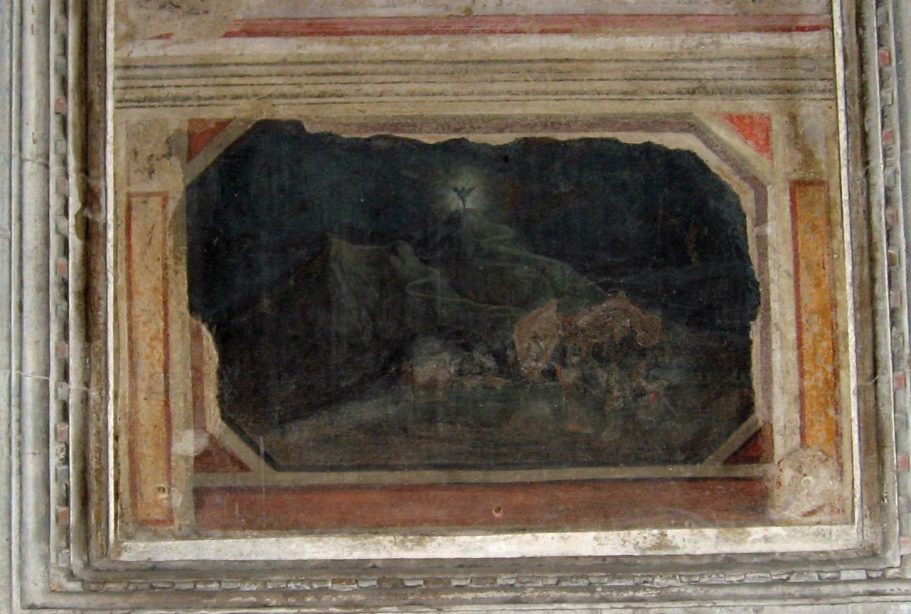 - NOTIZIE STORICO CRITICHE Sul presente pilastro è raffigurato San Michele Arcangelo; una lacunosa iscirizone, un tempo presente sull'affresco, oggi scomparsa ma ricordata dalla letteratura, rammentava il nome del committente, Vanni di Ristoro Niccoli, capitano della Compagnia di Orsanmichele nel 1350 e l'anno di esecuzione dell'opera" anno Domini MCCCLX... VII, letta 1338 dall'Horne e 1378 da Goretti Miniati. L'affresco è uno dei più antichi della chiesa e appartiene alla prima fase della decorazione pittorica che un documento ricorda parzialmente eseguita nel 1350. (A. S. F., Archivio delle Riforme; filza 40; vedi Colin W). Durante i restauri l'affresco è stato staccato e poi ricollocato in loco. Sotto la figura del santo è stata rinvenuta la sinopia ora conservata presso i depositi delle Gallerie Fiorentine. L'opera attribuita dal Vasari genericamente a Jacopo del Casentino sembra ridipinta. La scena sottostante, difficilmente leggibile per il cattivo stato di conservazione, raffigura l'apparizione di San Michele al vescovo di Siponto