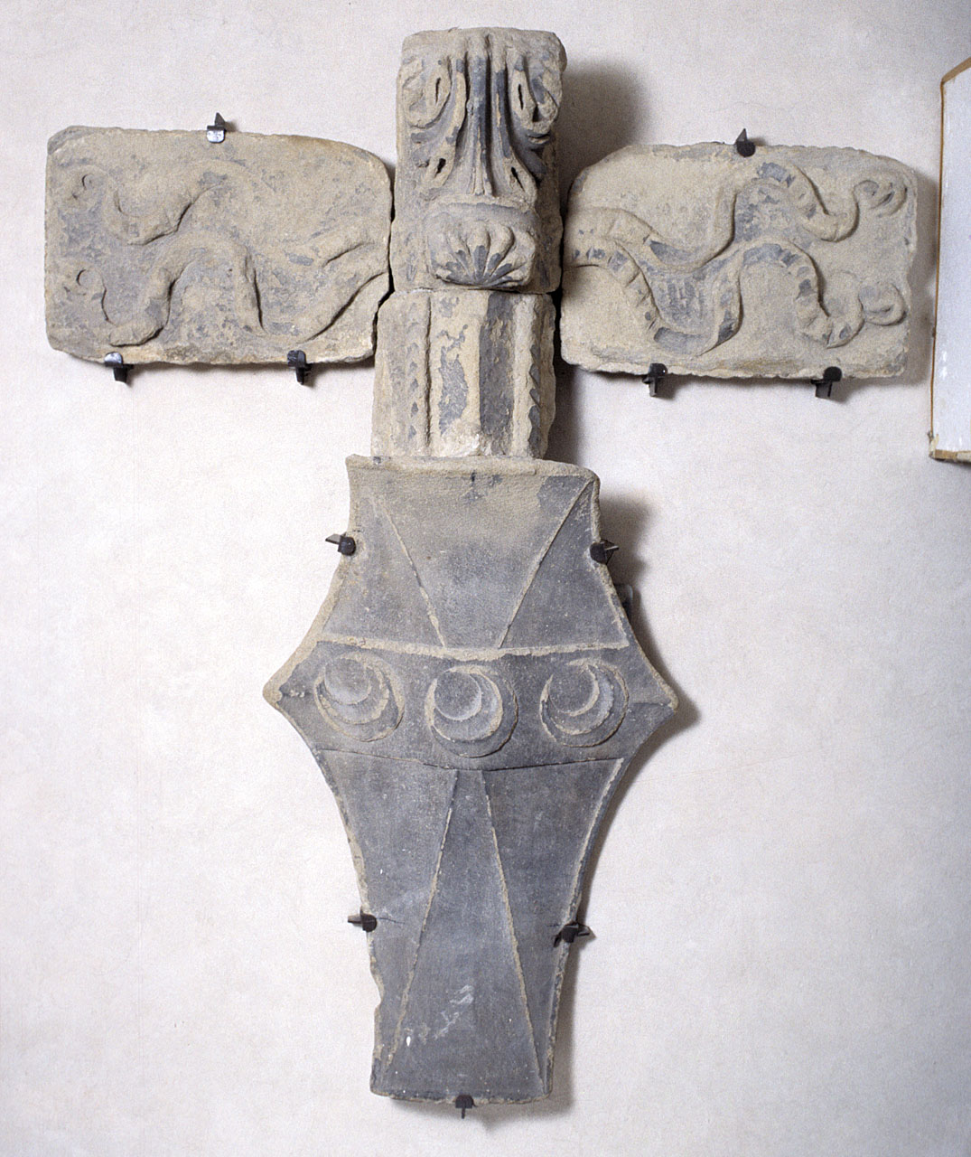 Scudo a testa di cavallo che pende da una mensola scolpita a foglie d'acanto per messo di nastri
