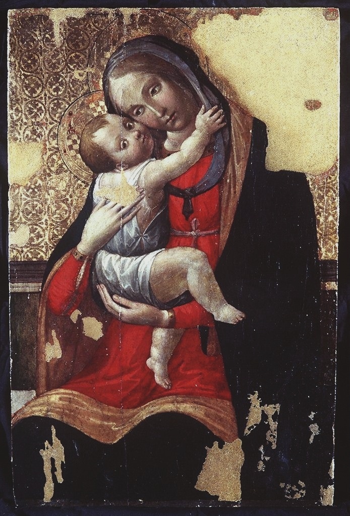 - NOTIZIE STORICO CRITICHE Madonna con Bambino di sapore abbastanza arcaizzante, per la presenza del fondo oro decorato a finta stoffa. La Madonna è seduta su uno scranno che poggia con la spalliera lignea sul finto drappeggio. L'abbraccio tra la Madonna e il Bambino riprende un motivo iconografico di Filippo Lippi, tuttavia si tratta di un'opera molto più avanti nel Quattrocento per i riferimenti botticelliani e ghirlandaieschi. Non escludei un accostamento con la pittura del Maestro di Marradi, cui si adatta l'arcaismo dello stile e del soggetto. Del dipinto conosciamo soltanto la provenienza dal Laboratorio Restauri della Fortezza da Basso nel 1977