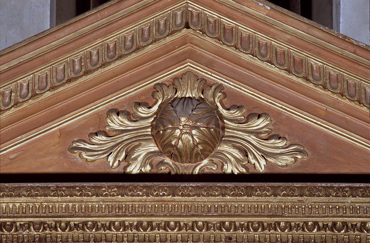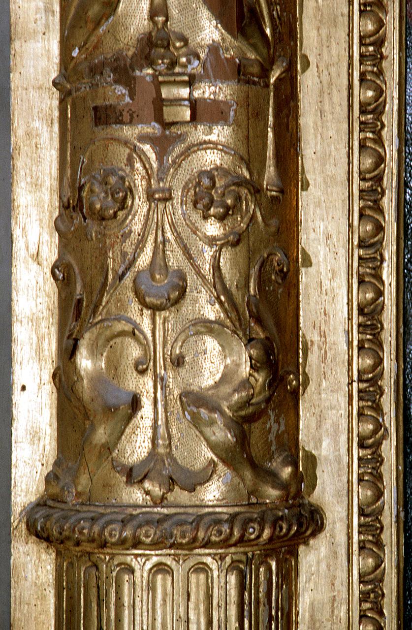 Cornice di tipo architettonico con mensole, colonne rudentate col fusto decorato e capitelli di ordine corinzio, architrave decorato, timpano