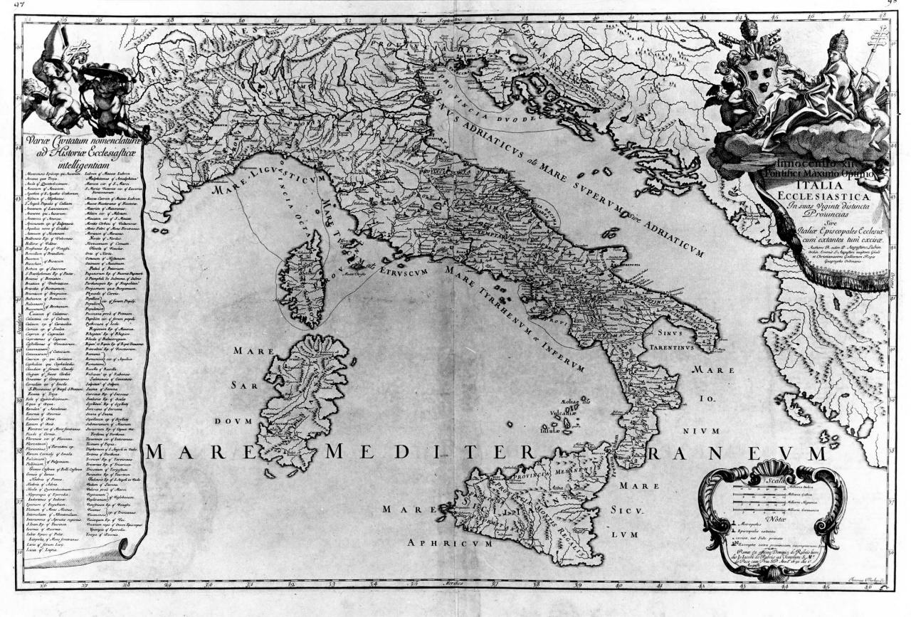 - ISCRIZIONI in alto a destra - INNOCENTIO XII PONTIFICI MAXIMO OPTIMO ITALIA ECCLESIASTICA IN SUAS VIGINTI DISTINCTA PROVINCIAS SIVE ITALIAE EPISCOPALES ECCLESIAE CUM EXTANTES TUM EXCISAE - corsivo -