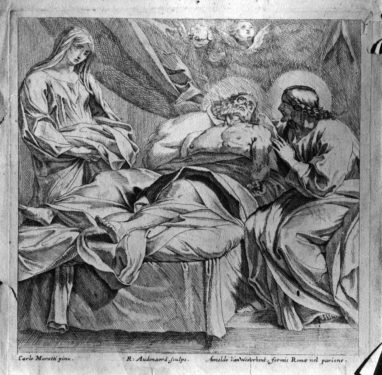 - NOTIZIE STORICO CRITICHE La morte di San Giuseppe è stato uno dei tanti soggetti iconografici del Maratti che venne inciso più volte. E' probabile che la stampa sia una riproduzione della tela realizzata dal pittore marchigiano per la cappella di S.Giuseppe della chiesa romana di Sant'Isidoro e che è andata perduta nel 1798, come ci informa il Bellori. Alcune opere del Maratti, che fu anche acquafortista fino al 1660 ca., furono tradotte in stampa dal suo allievo Robert van Audenaerd (attivo a Roma dal 1685 al 1723). Pertanto, è a questo periodo che si può ragionevolmente riferire anche la realizzazione di questa incisione. Un altro esemplare è conservato nel Gabinetto Nazionale delle Stampe a Roma (F.C., v. 58.N.19, inv. 122159)