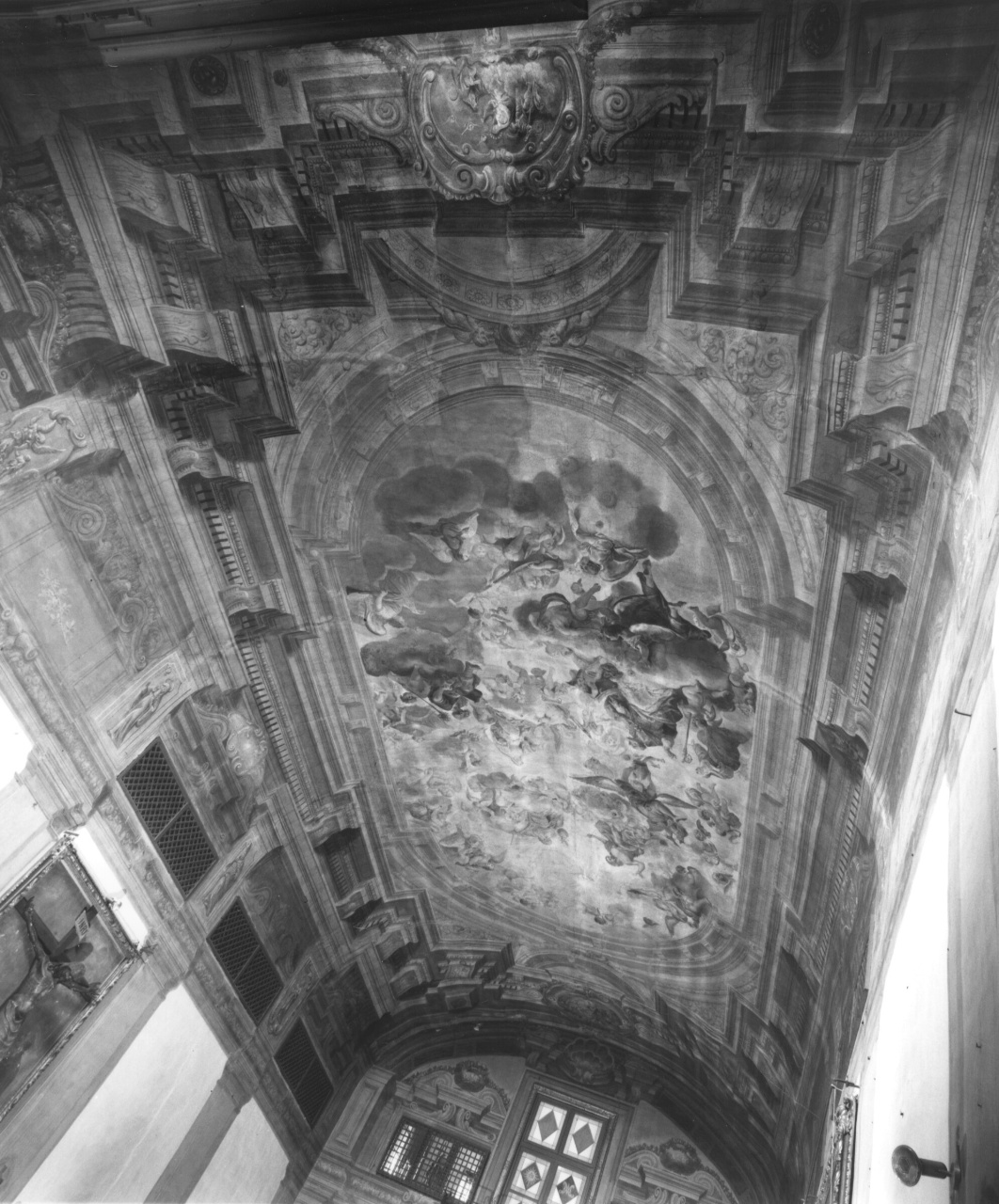 Soffitto interamente affrescato con finte architetture costituite da un'alta architrave dipinta nella parte alta delle pareti laterali su cui poggia un primo piano mensolato. A questo segue un secondo con due arconi posti nei due lati brevi. Questi sorreggono lo sfondato centrale figurato incorniciato da un alto mensolone. Sopra gli arconi vi sono coppie di putti con vasi di fiori. Due medaglioni istoriati sono inseriti negli elementi architettonici dei due lati brevi