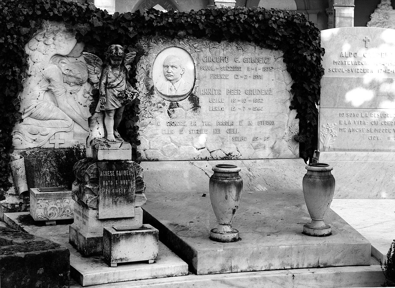 - NOTIZIE STORICO CRITICHE Il 14 febbraio 1956 viene sepolto, nel quadrato I fila V numero 4, Giacomo Gaudenz. L'anno successivo vengono esumati dal quadrato X e qui tumulati Giuseppe Gaudenzi, morto a nove anni nel 1929, e Agnese, nata e morta il 24 giugno 1917. Quindi sia la stele funeraria con la scritta Beppino che la piccola statua dedicata ad Agnese furono con ogni probabilità trasferite dal quadrato X, spazio destinato agli infanti, al quadrato I per creare un unico monumento sepolcrale della famiglia Gaudenz-Gaudenzi