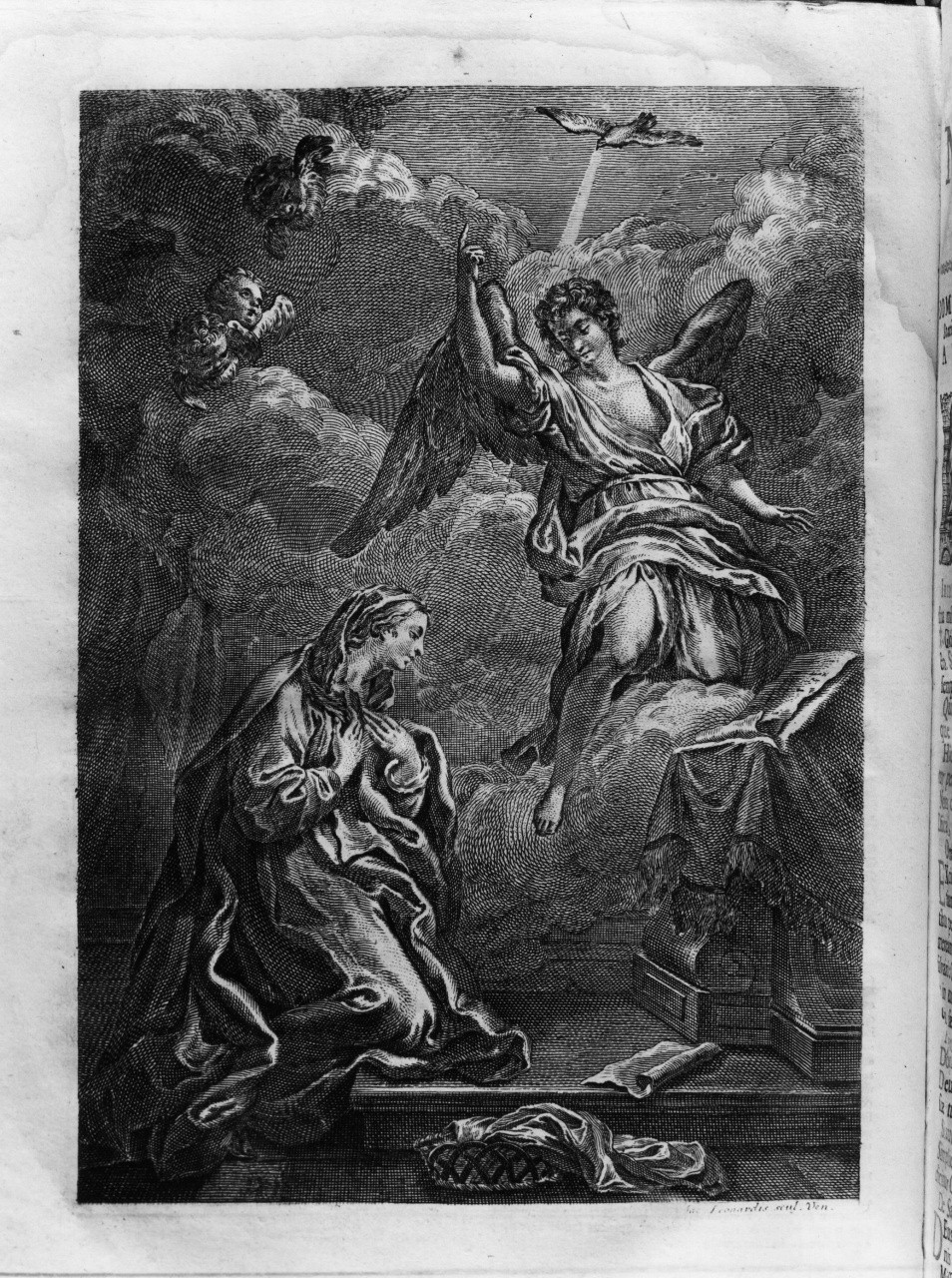 - NOTIZIE STORICO CRITICHE Giacomo Leonardis, dopo l'apprendistato a Venezia con il Tiepolo, abbandonò la pittura per dedicarsi all'incisione e i suoi primi rami noti risalgono alla seconda metà del sesto decennio, periodo in cui si dedicò prevalentemente all'incisione di illustrazioni per libri. Nei primi anni '60 il Leonardis iniziò a lavorare in proprio aprendo una calcografia. La stampa in esame è riprodotta di frequente nei testi ecclesiastici; un altro esemplare, sempre del Leonardis, si trova in un messale del 1774 presso la chiesa di San Pietro a Figline di Prato (scheda OA 0900301267), e un'altra in controparte in un altro messale del 1754 presso la stessa chiesa (OA 0900301269); su quest'ultima si legge il nome dell'artista francese Le Moine che, nato a Parigi nel 1688, si recò in Italia fra il 1723 e il '27 circa, morendo poi a Parigi nel 1737