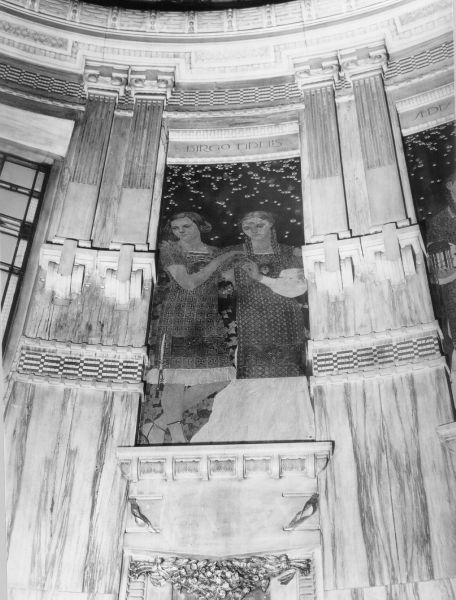 Nella parte superiore la cappella è decorata da un ciclo di dipinti murali. Fra gli aggetti delle lesene, segnate dalla sola tessitura del rivestimento marmoreo, sono rappresentate coppie di giovani donne. Alcune fasce orizzontali, ottenute con fregi a schacchiera rettangolari, suggeriscono la base e il capitello di ciascuna lesena virtuale. Sul soffitto della volta è dipinta una teoria di angeli, seguita da una serie di cornici concentriche, decorate con motivi geometrici. Nel cielo stellato compare un monogramma mariano