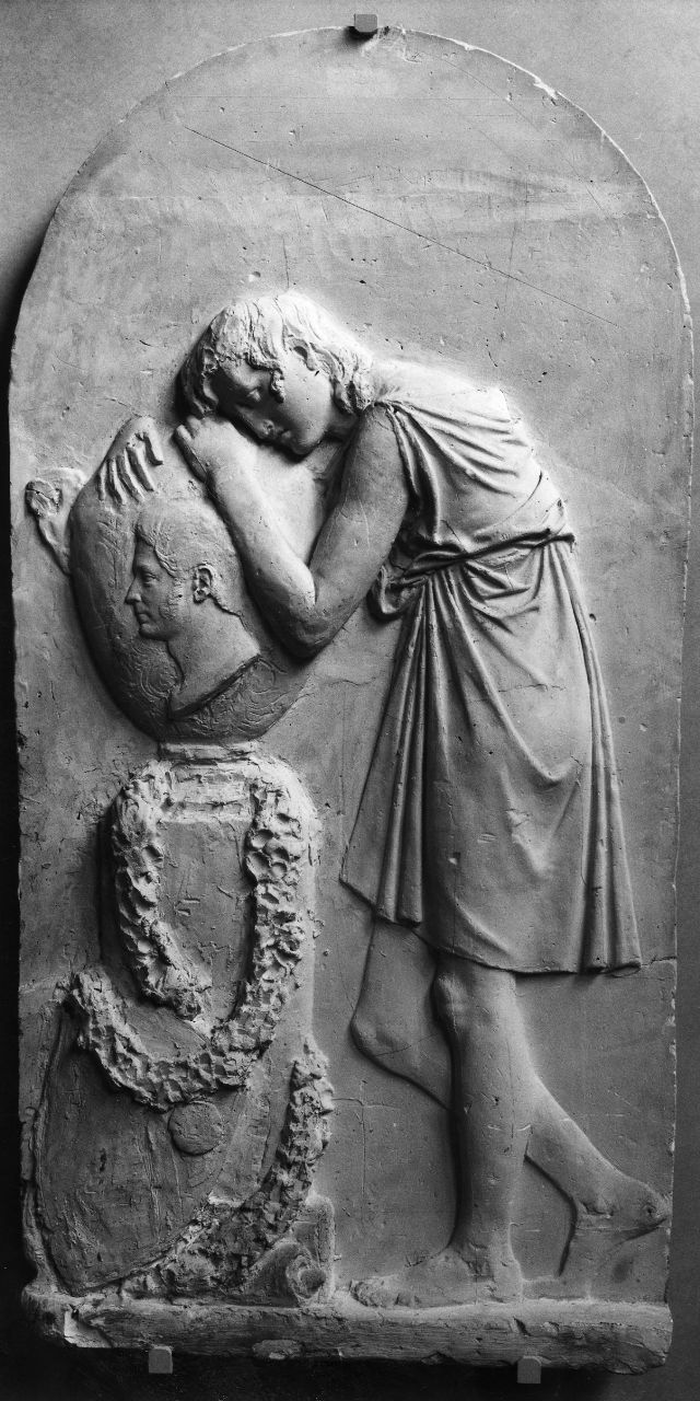 Modello in gesso per un rilievo funebre con un adolescente che piange abbracciato all'urna con l'effigie del defunto. Il cippo è avvolto da una ghirlanda che circonda uno stemma