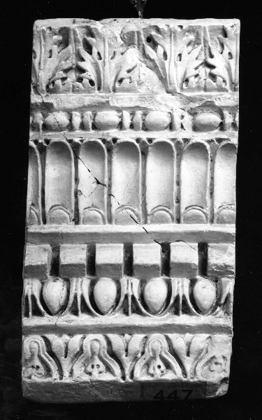 - NOTIZIE STORICO CRITICHE Il calco replica un frammento di ornato architettonico di ubicazione non identificata. Il modello trova certo riscontro nel catalogo del 1956 ma risale quasi certamente ad epoca anteriore. Non si può escludere facesse parte di un gruppo di gessi acquistati nel 1883 presso il Reale Museo Industriale di Torino e che vengono genericamente indicati come modelli di ornato. La supposizione non trova comunque conferma documentaria
