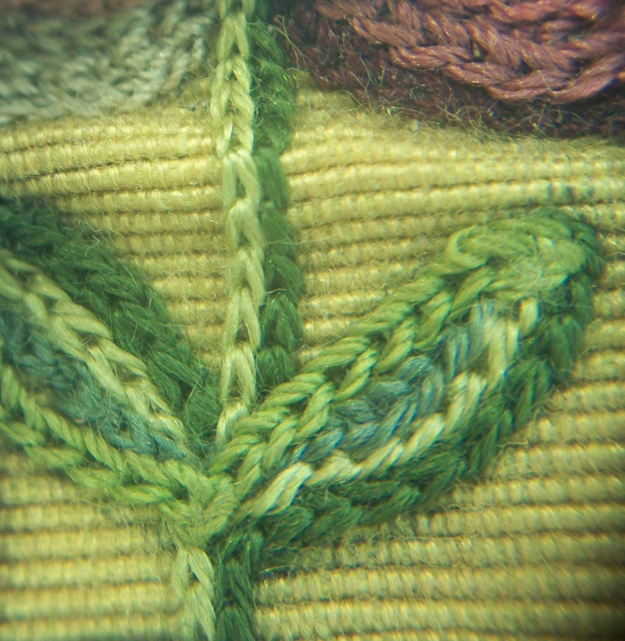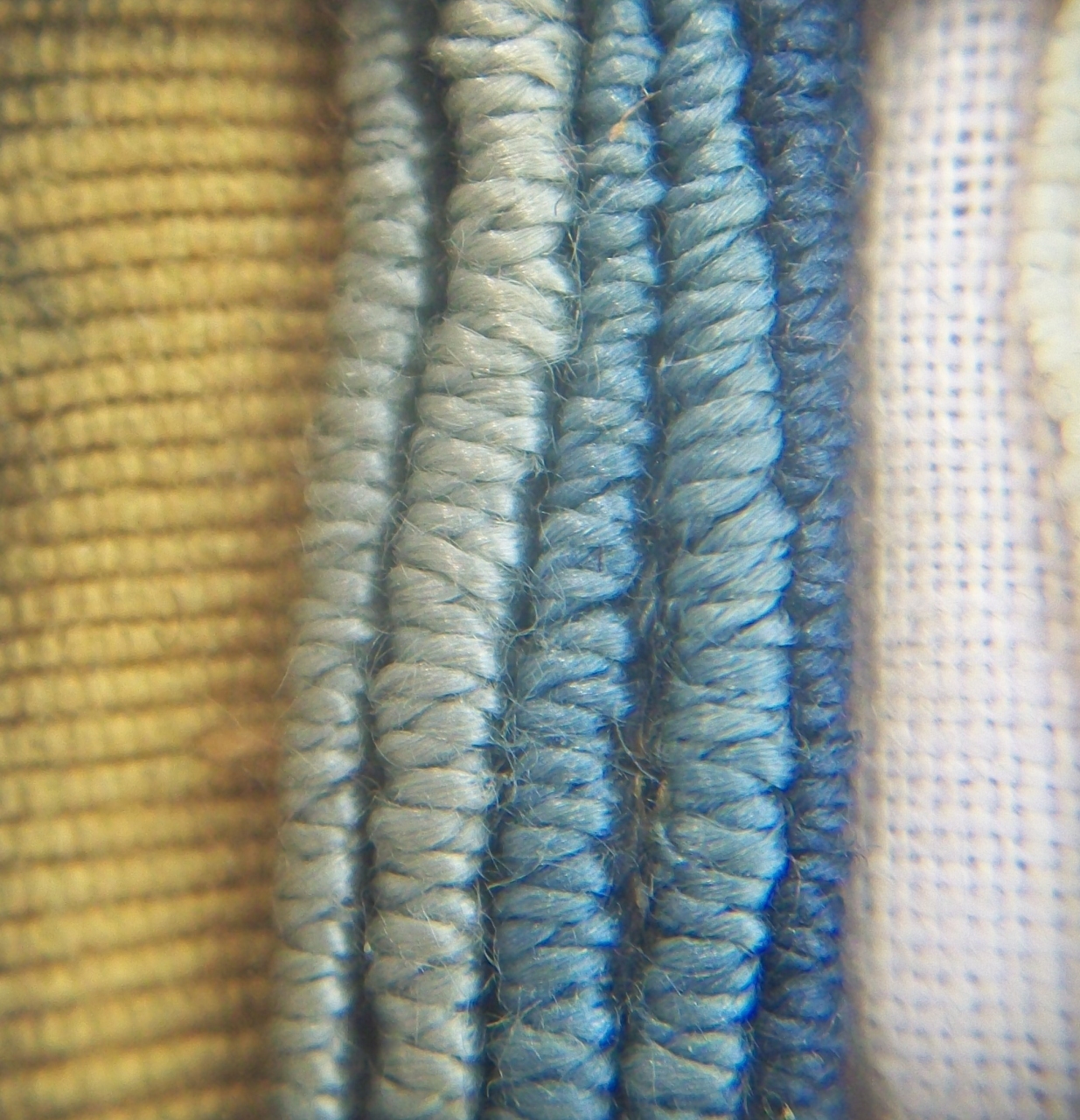 Frammento di ricamo eseguito su cannellato di seta e cotone giallo intenso, con profilature a punto cordoncino rinforzato (probabilmente eseguito meccanicamente, con la macchina Cornely) in filati di seta celeste e blu; fiore a tre petali sulle tonalità del rosa, su esile stelo con foglie, realizzato a punto catenella ("à tambour")