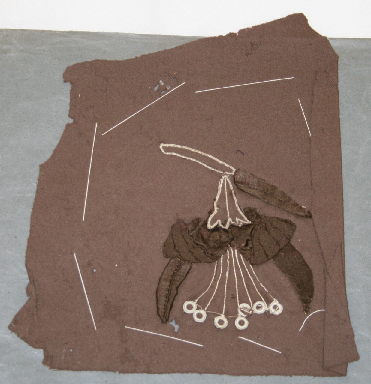 Esercitazione a ricamo in applicazione, con motivo di fiore in rilievo (iris); eseguita su panno di lana grigio topo, mediante riporto di tasselli nel medesimo materiale opportunamente sagomati, e nastrino in raso di seta marrone scuro, con nervature in rilievo (fissate a punto filza); profilature e nervature in filato di cotone avorio (punti festone imbottito, erba); pistilli costituiti da occhielli traforati, a punto occhiello (filato di cotone avorio)