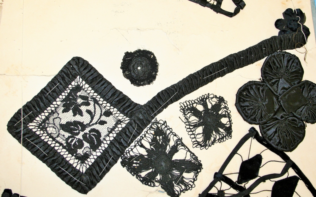 Guarnizione per abbigliamento costituita da tassello quadrato in merletto meccanico (Pusher) di seta nero, a motivi floreali, profilato da nastrino fittamente pieghettato, in raso di seta e cotone nel medesimo colore, con propaggine allungata conclusa da fiore tridimensionale stilizzato, con pistillo e petali in velluto, avvolti da strato di chiffon in tinta. Filato in cotone nero, a punto incrociato, collega merletto e nastrino