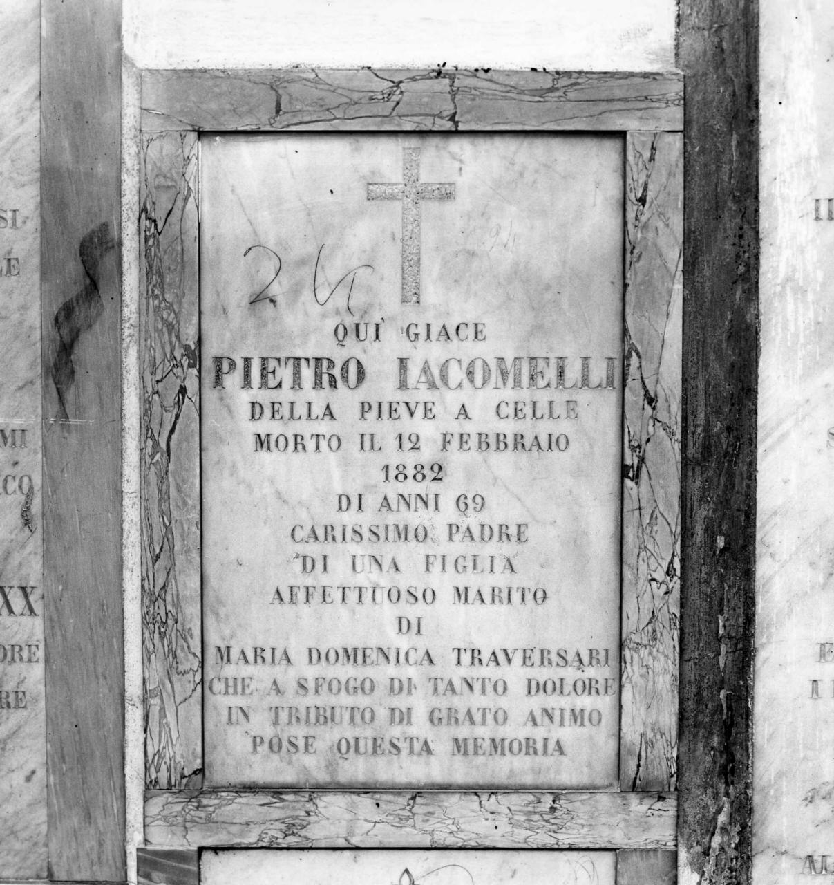 - ISCRIZIONI QUI GIACE / PIETRO IACOMELLI / DELLA PIEVE A CELLE / MORTO IL 12 FEBBRAIO / 1882 / DI ANNI 69 / CARISSIMO PADRE / DI UNA FIGLIA / AFFETTUOSO MARITO / DI / MARIA DOMENICA TRAVERSARI / CHE A SFOGO DI TANTO DOLORE / IN TRIBUTO DI GRATO ANIMO / POSE QUESTA MEMORIA - lettere capitali -