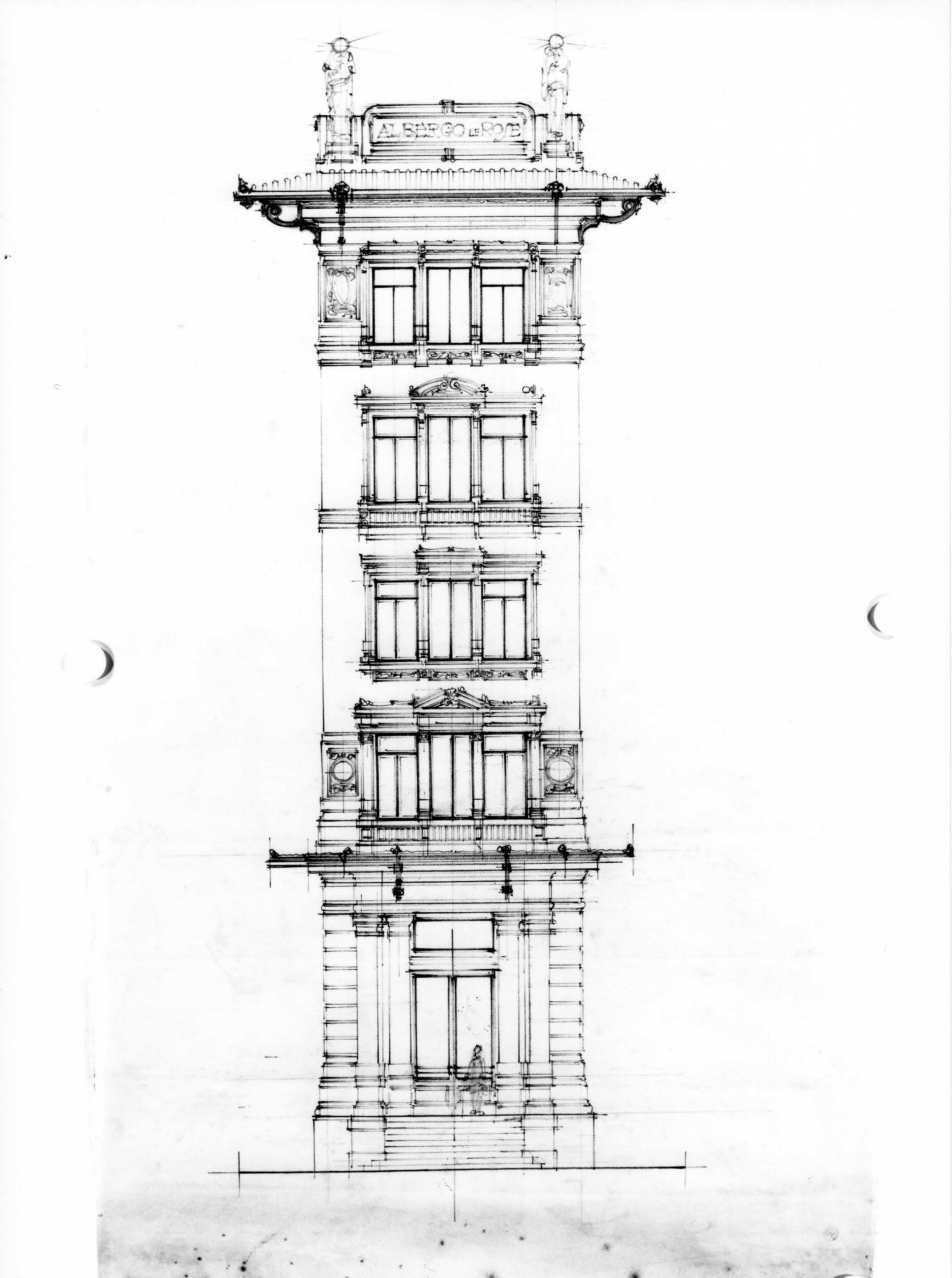albergo Le Rose a Viareggio: prospetto in scala 1:50 della facciata d'angolo