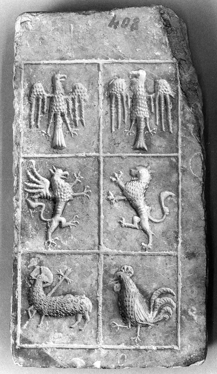 - NOTIZIE STORICO CRITICHE Questa lastra di marmo incisa su due facce, presenta su un lato una suddivisione in sei riquadri, ciascuno contenente una figura di carattere araldico o emblematico: si riconoscono un gallo, l'agnello eucaristico, un leone, un grifo, due aquile. Sull'altro lato è inciso un cerchio sommariamente decorato a ghirlanda e all'interno un trittico con la Madonna col Bambino al centro e due angeli ai lati. E' probabile si tratti di una matrice per la realizzazione di piccoli manufatti metallici destinati a decorare abbigliamento civile o ecclesiastico: non si esclude ad esempio che il tondo con il trittico, di dimensioni sufficientemente grandi, potesse essere utilizzato per la realizzazione di una sorta di borchia metallica per agganciare lo stolone di un piviale. Le caratteristiche della figurazione e anche degli animali araldici suggeriscono per questo manufatto una dazione verso la fine del XIV secolo. Non si esclude una esecuzione fiorentina per le caratteristiche del trittico e anche per la presenza tra le figure araldiche dell'Agnello mistico emblema dell'Arte della Lana e del gallo, emblema del Bigallo