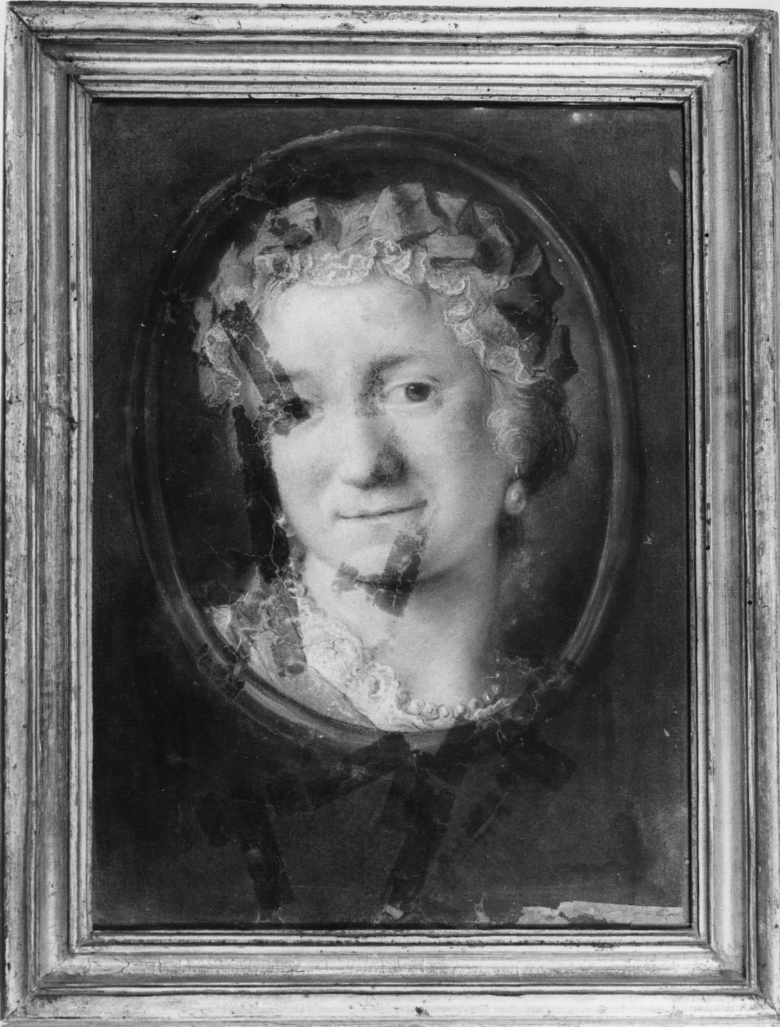 L'autoritratto della pittrice Rosalba Carriera, è di forma ovale ed è posto all'interno di una cornice rettangolare semplicemente modanata. Il pastello rappresenta l'artista in età matura rappresentata con cuffia decorata da nastri, orecchini e collana di perle. L'opera è deturpata dai segni lasciati dal nastro adesivo. Sul telaio è presente un cartellin o con iscrizione