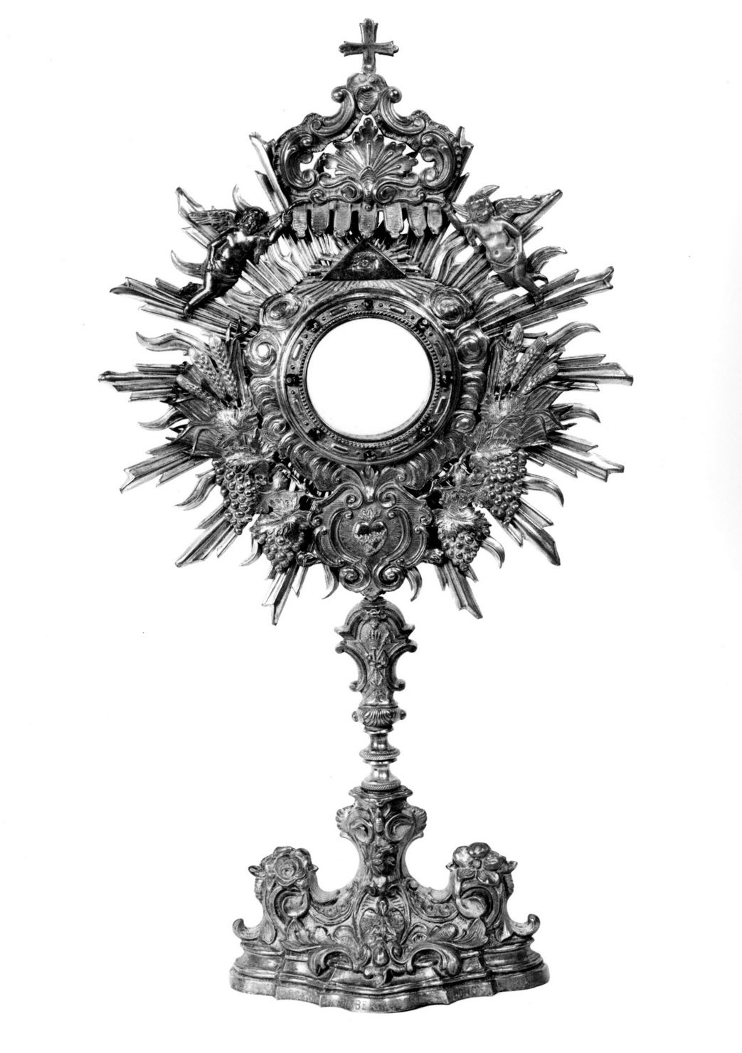 ostensorio raggiato con piede mistilineo modanato riccamente decorato a volute vegetali e fiori a sbalzo; fusto esile e slanciato; nodo sagomato, al centro sono presenti gli strumenti della passione; la raggiera, a fasci di raggi con spighe e grappoli d'uva, si diparte da un circolo di nuvole che reca alla base una cartella con inciso il cuore fiammeggiante e alla sommità l'occhio divino; teca: a luce circolare; baldacchino sorretto da angeli in volo; crocetta apicale a terminazioni trilobate