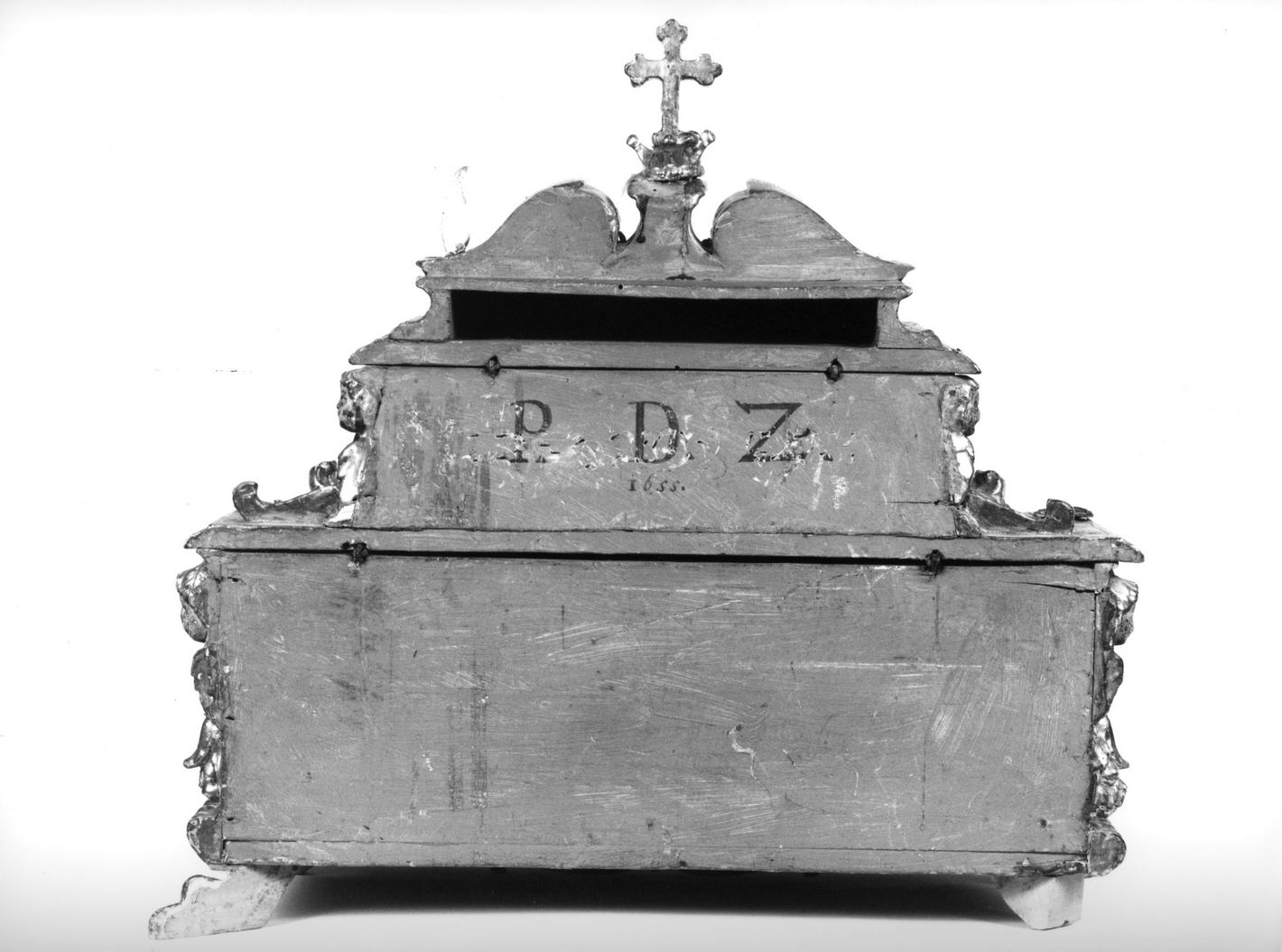reliquiario, poggiante su zampe leonine, con corpo principale a forma di parallelepipedo decorato sul fronte da tre teche quadrate incorniciate da motivi a ovoli e all'interno da volute. Su tutta la superficie sono presenti punzonature e intagliate testine di cherubini. Soprastante é collocato un altro parallelepipedo più piccolo, sempre riccamente decorato con due teche rettangolari, che termina con due volute affrontate e croce al centro