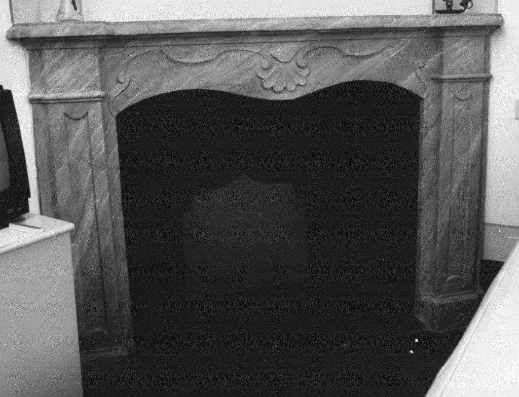 Mostra di camino con stipiti con podio e specchiatura mistilinea incassata, apertura architravata con profilo ondulato e decoro a rilievo con nicchia centrale, cornice a mensola aggettante potenziata ai lati