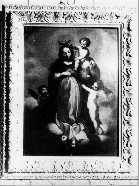 Cornice in legno intagliato e dorato, decorata da foglie. La Vergine è in piedi sopra la luna, dalla parte sinistra ha un angelo che sostiene il globo del mondo, sopra cui è il bambino Gesù che incorona la madre. Un altro angelo sostiene il manto della Madonna. In basso ai piedi della Madonna stanno tre cherubini