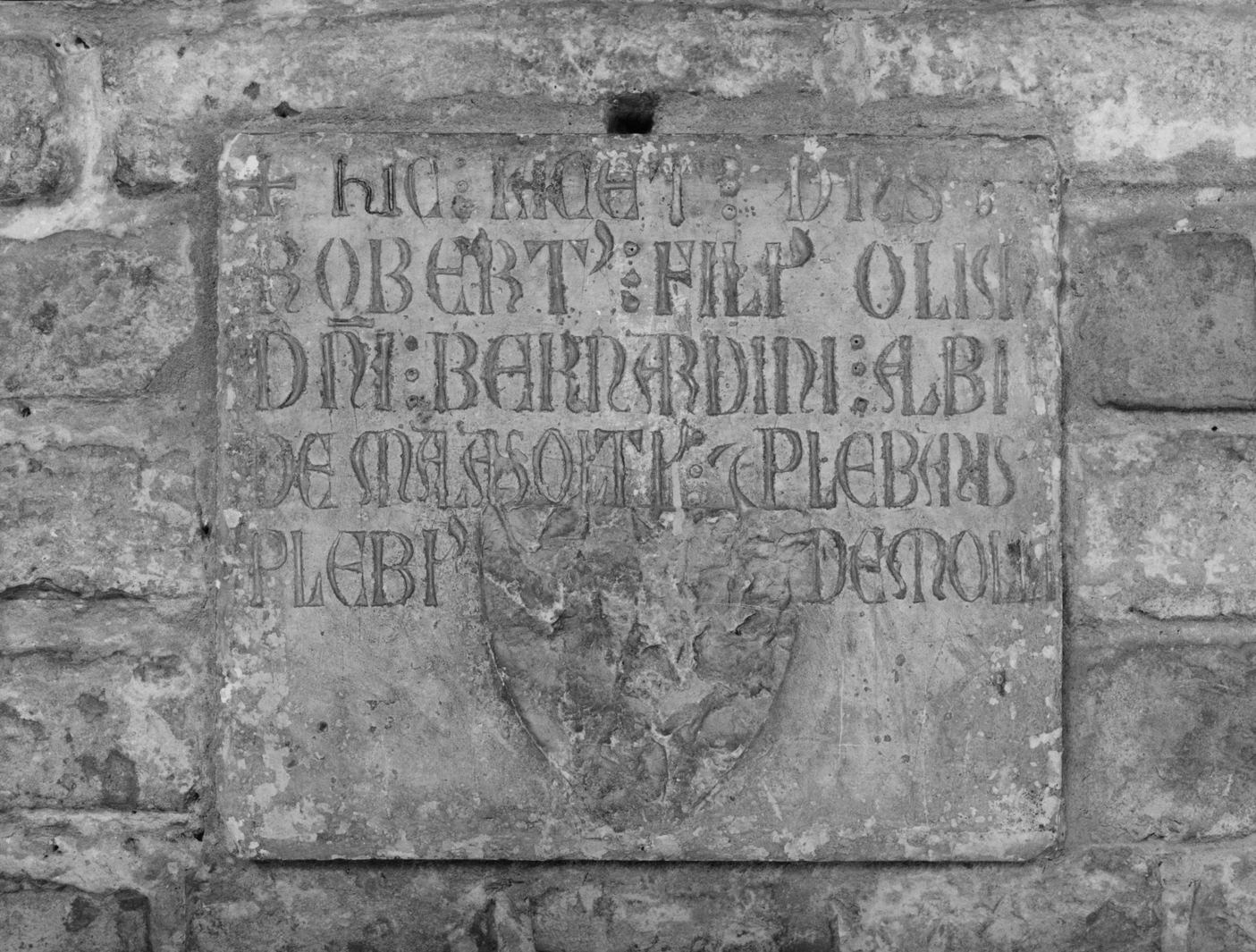 - ISCRIZIONI sulla lapide - HIC INCET (...)/ ROBERT(O) FILI(I) OLI(...)/(...)BERNARDINI (...)/ DE MALAVOLTI PLEBANIS/PLEBI(...)(...)DEMOL(...) - caratteri gotici -