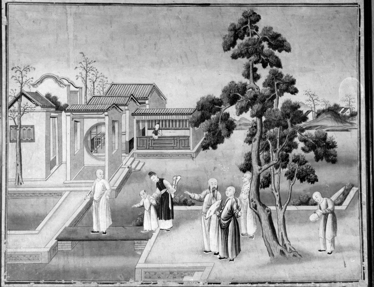 - NOTIZIE STORICO CRITICHE Il dipinto fa parte di una vasta raccolta di esemplari simili per soggetto e provenienza, arrivati alla corte granducale in seguito all’iniziativa di Pietro Leopoldo di Lorena, il quale cominciò a rifornirsi di carte cinesi durante la seconda metà del Settecento. Subito dopo il loro arrivo in Italia, i rotoli vennero ritagliati e racchiusi entro cornici di legno, assumendo così l’aspetto di quadretti, destinati ad essere appesi alle pareti secondo il gusto occidentale. La maggior parte di essi, la cui presenza è documentata a partire dal 1785, fu utilizzata per allestire varie stanze della Villa medicea di Castello. In seguito tali allestimenti furono smembrati e i quadretti presero vie diverse, giungendo in parte alla Villa della Petraia. Si tratta di una produzione alla “chinese”, come viene indicato anche negli inventari, rappresentante vedute e scenette di vita cinese