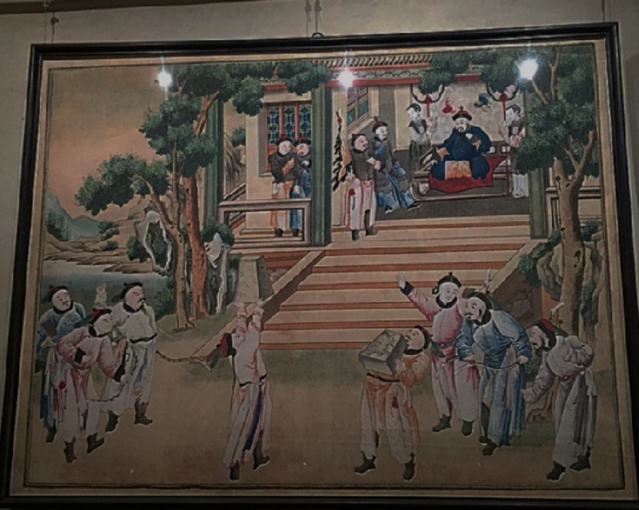 - NOTIZIE STORICO CRITICHE Il dipinto fa parte di una vasta raccolta di esemplari simili per soggetto e provenienza, arrivati alla corte granducale in seguito all’iniziativa di Pietro Leopoldo di Lorena, il quale cominciò ad appassionarsi ed a fornirsi di carte cinesi durante la seconda metà del Settecento. Subito dopo il loro arrivo in Italia, i rotoli vennero ritagliati e racchiusi entro cornici di legno, assumendo così l’aspetto di quadretti, destinati ad essere appesi alle pareti secondo il gusto occidentale. La maggior parte di essi, la cui presenza documentata a partire dal 1785, fu utilizzata per allestire le varie stanze della Villa medicea di Castello. In seguito, tali allestimenti furono smembrati e i quadretti presero vie diverse, giungendo in parte alla Villa della Petraia. Si tratta di una produzione alla “chinese”, come viene indicato anche negli inventari. Solitamente, come si nota, si rappresentano vedute o scene di vita cinese, le quali si svolgono con un andamento verticale, in cui si trova un villaggio adagiato lungo un corso d’acqua, animato da numerosi personaggi intenti in molteplici attività, in questo caso si tratta di atleti dinanzi ad un’autorità cinese