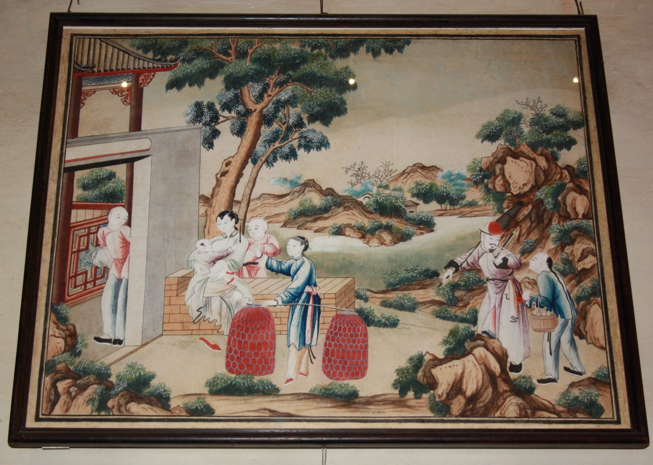 - NOTIZIE STORICO CRITICHE iIl dipinto fa parte di una vasta raccolta di opere simili per soggetto e provenienza che dal 1785 si trovava nella Villa di Castello, dove figura ancora negli inventari del 1816. La raccolta fu smembrata dopo l’Unità d’Italia. Si tratta di una produzione pittorica alla “chinese”, come viene descritto negli inventari, con scene di paesaggi fluviali, case e personaggi con attributi all’orientale, intenti in scene di vita quotidiana. Quadretti stilisticamente affini a quelli qui descritti sono presenti nel cosiddetto ‘Salottino Cinese’ della Villa di Poggio Imperiale di Firenze, raffiguranti paesaggi e scene di vita orientale