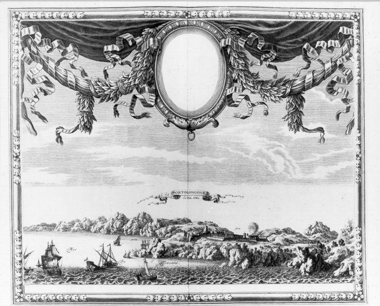 - NOTIZIE STORICO CRITICHE La grande stampa illustra il Forte di Portolongone (poi Porto Azzurro) vistodalla costa toscana. La veduta è inquadrata in un'ampia cornice rettangolarecon un grande ovale vuoto sostenuto da un ricco festone, destinato ad una scrittadedicatoria. Più in basso si vede un nastro con la scritta Portolongone, e ladata 1646. L'insieme della composizione fa supporre che la stampa fosse destinataalla funzione di frontespizio di una raccolta di stampe. La data dell'opera,e la sua provenienza dall'ambito francese la pongono in relazione con l'assediodi Portolongone da parte dei francesi (dal 1646 al 1650). Essa forse facevaparte medesima raccolta che conteneva la pianta dettagliata della roccaforte(cfr. scheda n.09 00406661) predisposta per chiari scopi militari