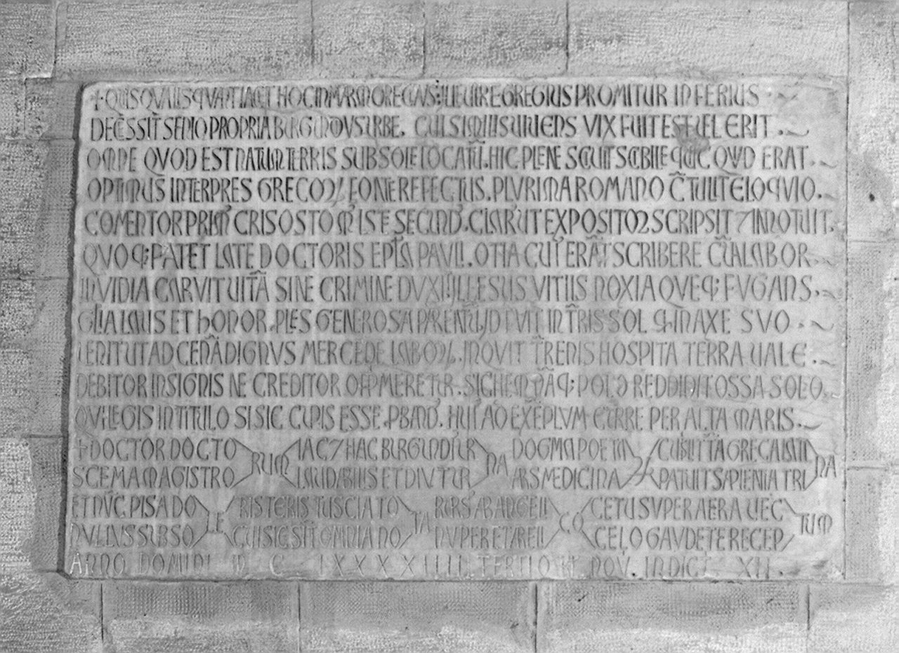 - ISCRIZIONI su tutta la superficie - QUIS QUALIS QUANT(US) IACET HOC IN MARMORE CLAUS(US) ILLE VIR EGREGIUS PRO MITUR INFERIUS / DECESSIT SENIO(R) PROPRIA BURGUNDIUS URBE CUI SIMILIS VIV ENS VIX FUIT EST VEL ERIT / OMNE QUOD EST NATUM TERRIS SUB SOLE LOCATU(M) HIC PLENE SCIVIT SCIBILE QUICQUID ERAT / OPTIMUS INTERPRES GRECO(---) PLU RIMA ROMANO C(ON)TULIT ELOQUIO / COMENTOR PRIM(---)CRISOSTOM(US) ISTE SECU ND(US) CLAR(---) UT EXPOSIT(---) SCRIPSIT (ET) INNOTUIT / QUO Q(---) PATET LATE DOCTORIS EP(ISTU)L(AS) PAULI OTIA CUI ERAT SCRIBERE C(---)LABOR / IN VIDIA (---) SINE CRIMINE DUXIT ILLESUS VITIIS NOXIA QUEQ(UE) FUGANS / (--- ) ET HONOR PLES GENEROSA PARENTU(M) (---) IN T(ER)RIS SOL (---) IN AXE SUO / VENIT UT AD CENA(M) DIGNUS MERCEDE LABO(---) INQUIT T(ER)RENIS HOSPITA TERRA VALE / DEBITOR INSIGNIS NE CREDITOR OPP(RI)MERETUR SIC NEM(---) NA(M )Q(UAM) PO(---) REDDIDIT OSSA SOLO / QUI LEGIS IN TITULO SI SIC CUPIS ESS E P(RO)BAND(US) HUI(US) AD EXE(M)PLUM CURRE PER ALTA MARIS / DOCTOR DOCTOR UM IAC(ET) HAC BURGUNDI U - lettere capitali - a incisione -