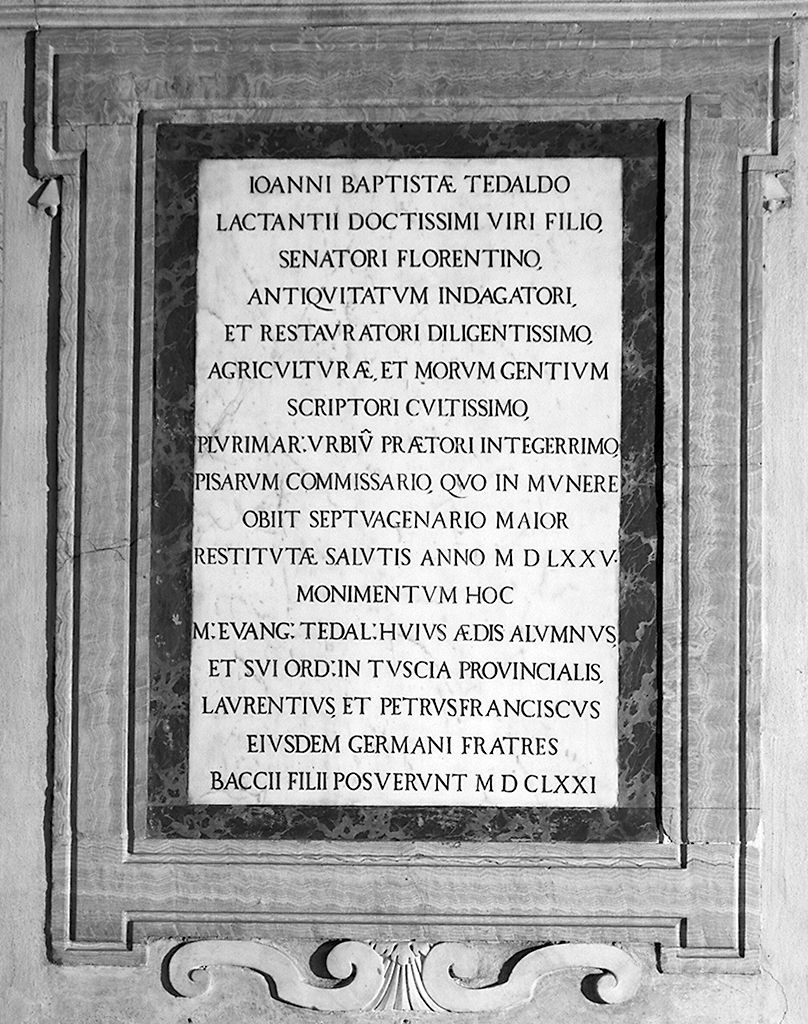 - ISCRIZIONI al centro della lapide lato sinistro - IOHANNEM DE TEDALDIS BALDI PIEROZZI QUI SACELLUM / HOC OLIM D(---) EVANGELISTAE DICATUM MAGNIFICE RESTITUIT / FILIUM GENERE VIRTUTE PIETATE CLARUM REIPUBLICAE / FLORENTINAE HONORIBUS INSIGNEM COSMI I MAGNI ETRU / RIAE DUCIS MAIOREM DOMI ARCHIPREFECTUM FLORENTIAE / SENATOREM CUM UXORE NANNA DE NERLIS SEPULTUM / ANNOS NATUM OCTO ET QUINQUAGINTA ATAVUM SUUM / OPTIME PROMERITUM HOC MONIMENTO RECOLVIT SAL(UTIFERO) AN(NO) / MDCLXXI MAG(---) EVANGELISTA TEDALDUS BACCII FILIUS / SERVITARUM IN TUSCIA PROVINCIALIS - lettere capitali -